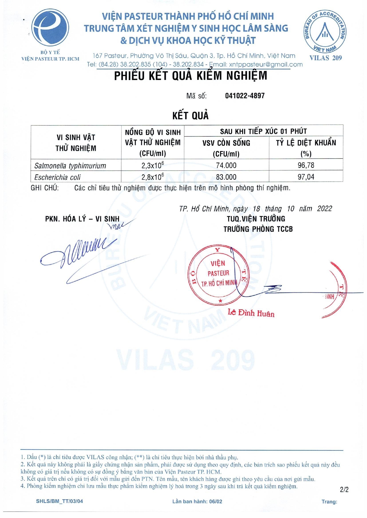 • Diệt khuẩn lên đến 97% đã được Viện Pasteur chứng nhận.