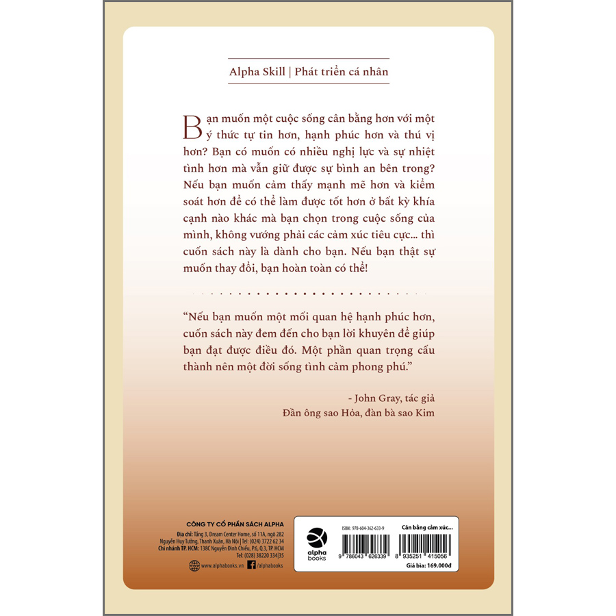 “Cân bằng cảm xúc mọi lúc mọi nơi” là cuốn sách giải thoát bạn khỏi những cảm xúc có thể kiểm soát, trói buộc bạn, đôi khi rất khó thấy nhưng luôn luôn có tác động đáng kể và tiêu cực lên phương hướng cuộc đời bạn. Cuốn sách dành cho tất cả những người đang gặp khó khăn trong việc kiểm soát các cảm xúc của chính mình, cảm thấy cuộc đời mình đang rơi vào bế tắc và đau khổ. Những người hay tức giận mất kiểm soát, lo âu, trầm cảm, tự cảm thấy bản thân đáng thương hoặc vô dụng.
