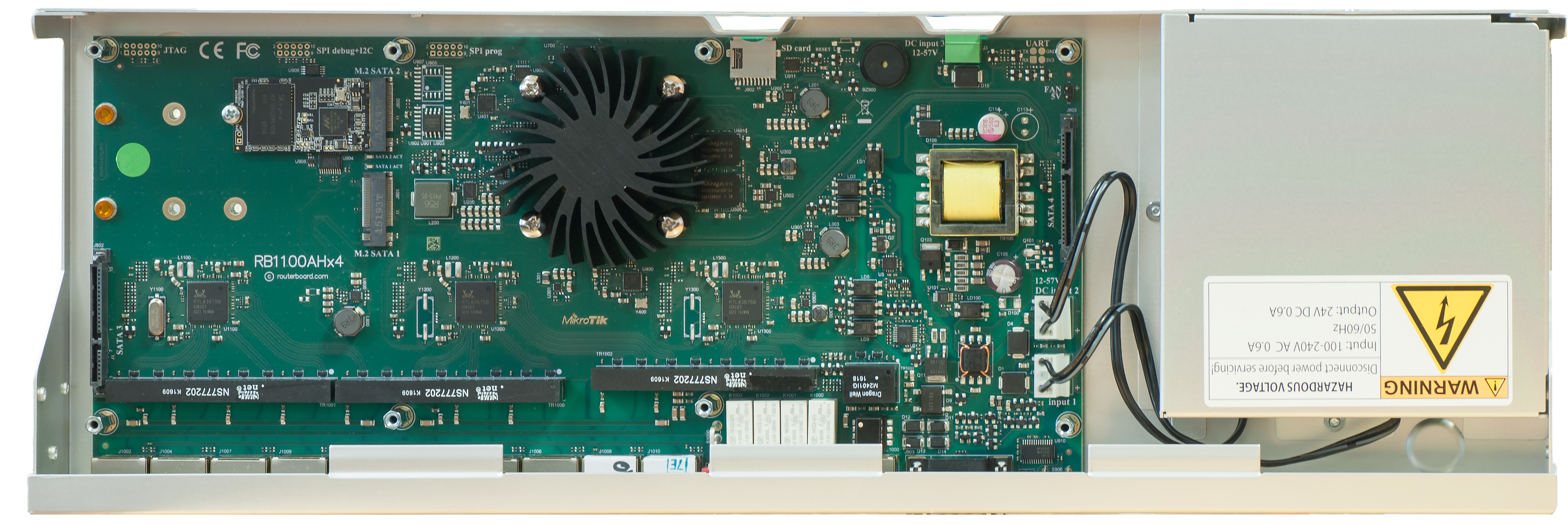 Unit comes with 1U rackmount case, 13x Gigabit Ethernet ports, RS232 serial port and dual redundant power supplies (with -48v DC telecom power and 802.3at/af support). The RB1100AHx4 Dude edition features several high speed storage connectors (two SATA and two M.2) for using a Dude database, proxy cache or any other storage intensive feature. It includes a 60GB M.2 drive already installed.