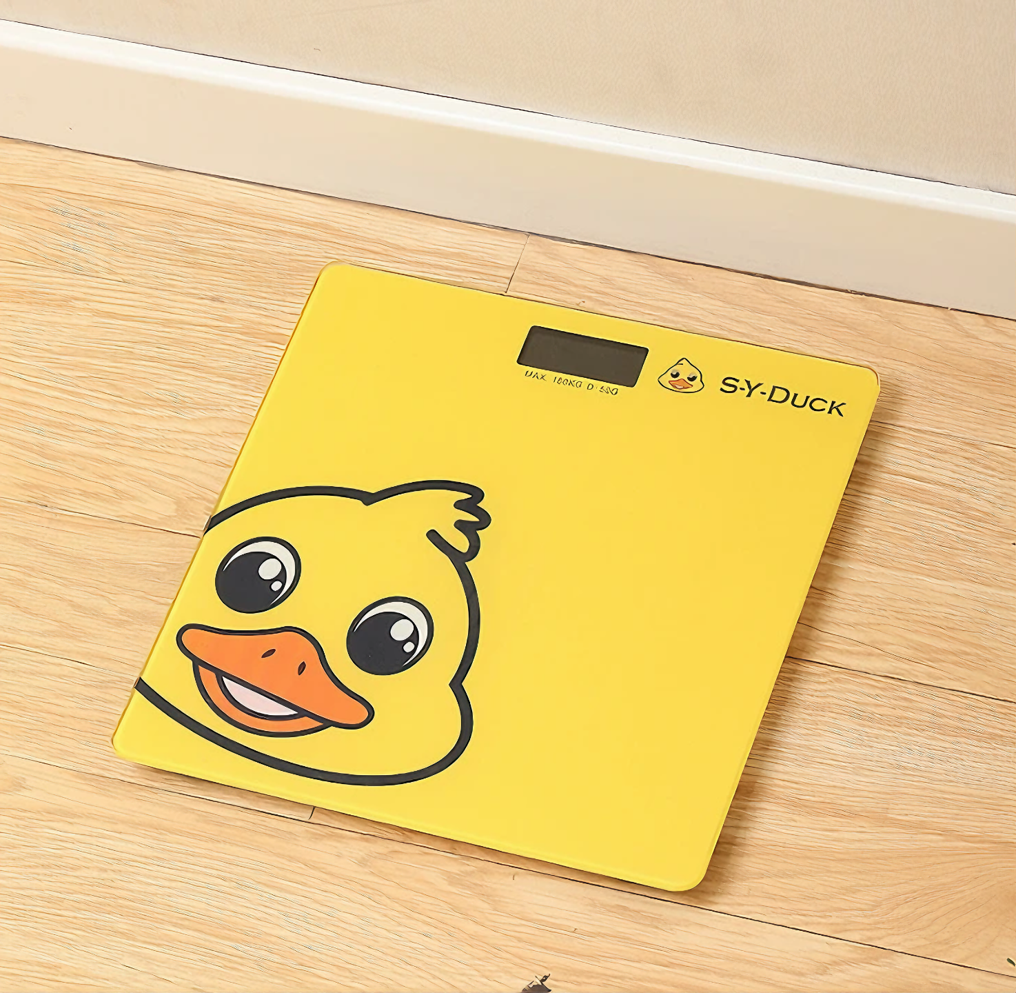Cân Sức Khỏe 180kg Sai Số 50gr SY DUCK Chú Vịt Vàng Chất Liệu Bề Mặt Kính Chịu Lực Dùng Nguồn Pin