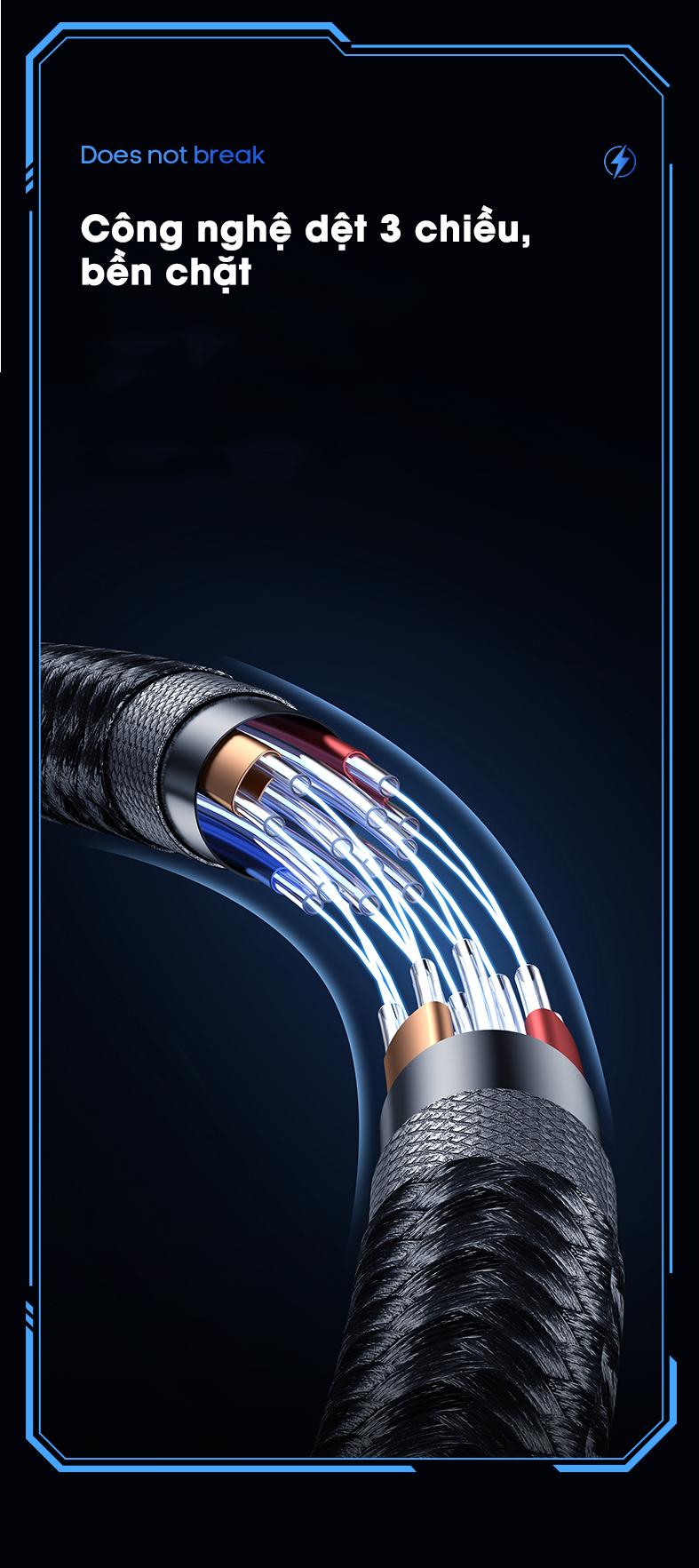 1. Chiều dài 1,2m. Trọng lượng: 42g. 2. Chất liệu bên ngoài: nylon dệt. 3. Chất liệu đầu nối: hợp kim nhôm. 4. Lõi: 178 dây đồng năm lõi, dòng điện lên đến 3A. 5.