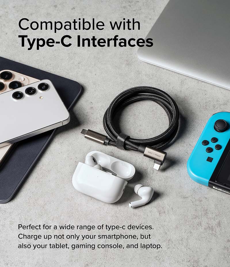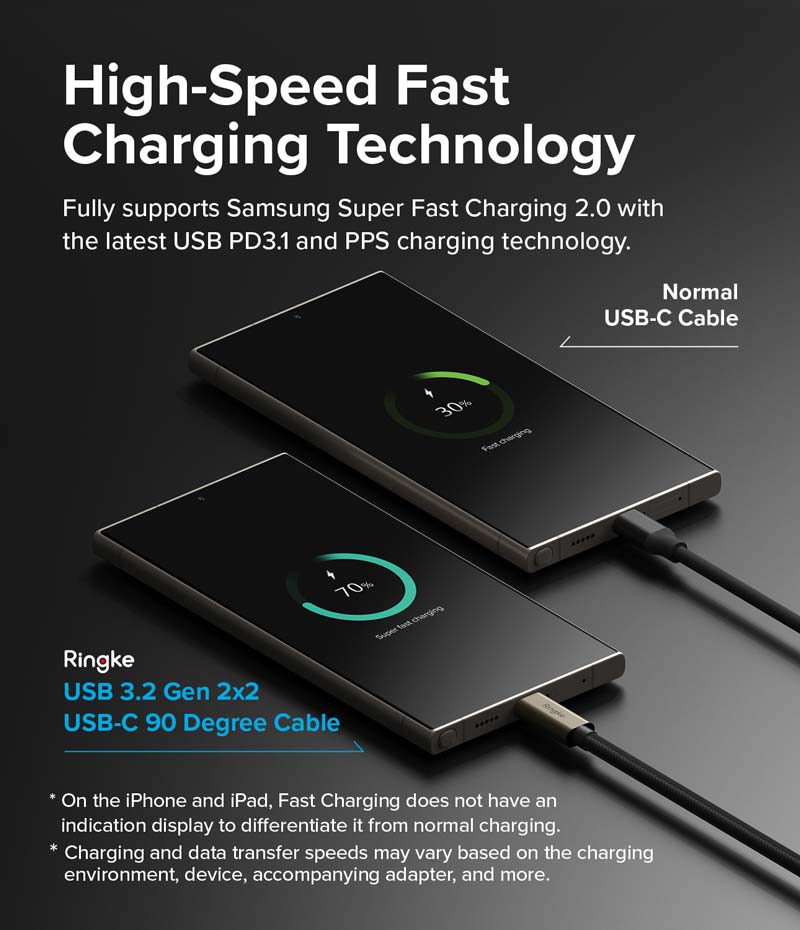 Cáp Ringke 90 Degree USB 3.2 Gen 2X2 USB-C Cable cung cấp giải pháp kết nối đồng bộ dữ liệu giữa các thiết bị có cổng kết nối chuẩn USB-C với tốc độ truyền tải tối đa 20Gbps, truyền phim HD hoặc các tập tin lớn chỉ trong vài giây. Cáp Ringke 90 Degree USB 3.2 Gen 2X2 USB-C Cable hỗ trợ công nghệ PD 3.1 (Power Delivery), cho phép sạc nhanh các thiết bị tương thích với công suất lên đến 240W. Bạn có thể sạc nhanh cho laptop, điện thoại di động, máy tính bảng và các thiết bị khác hoặc truyền tải dữ liệu nhanh chóng.