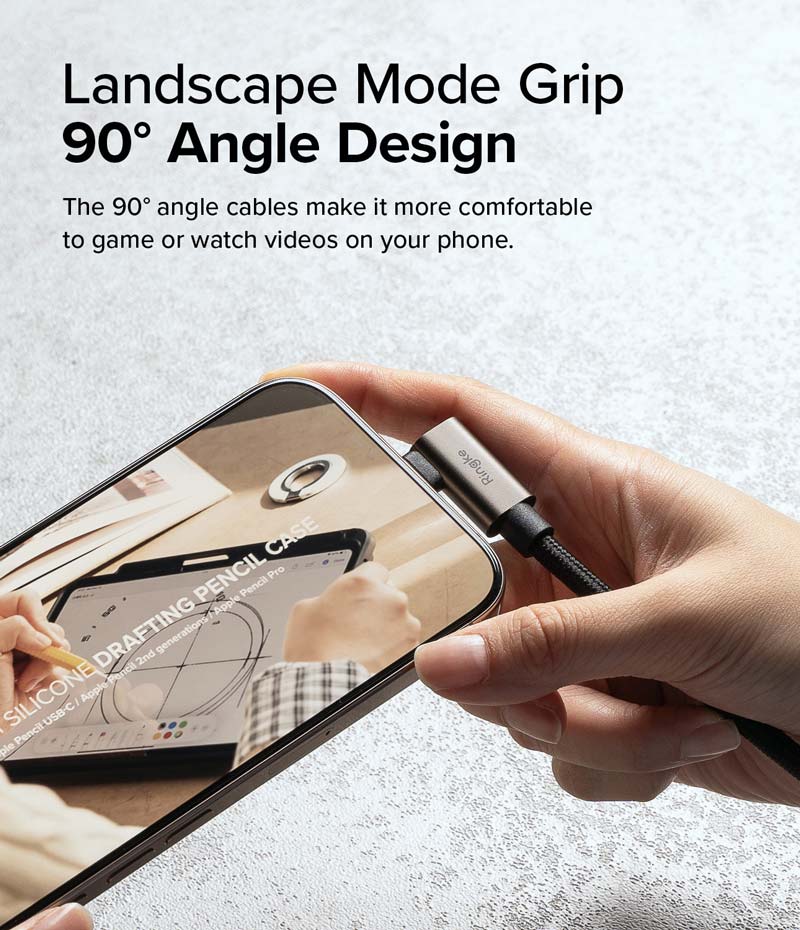 Cáp Ringke 90 Degree USB 3.2 Gen 2X2 USB-C Cable có cấu trúc lõi chất lượng cao giúp giảm khả năng mất dữ liệu, hỗ trợ chất lượng hình ảnh rõ nét và cung cấp khả năng sạc ổn định. Sợi cáp bên ngoài được làm từ chất liệu nylon đảm bảo độ bền, chắc chắn, chống rối và chống trơn trượt khi cầm nắm.