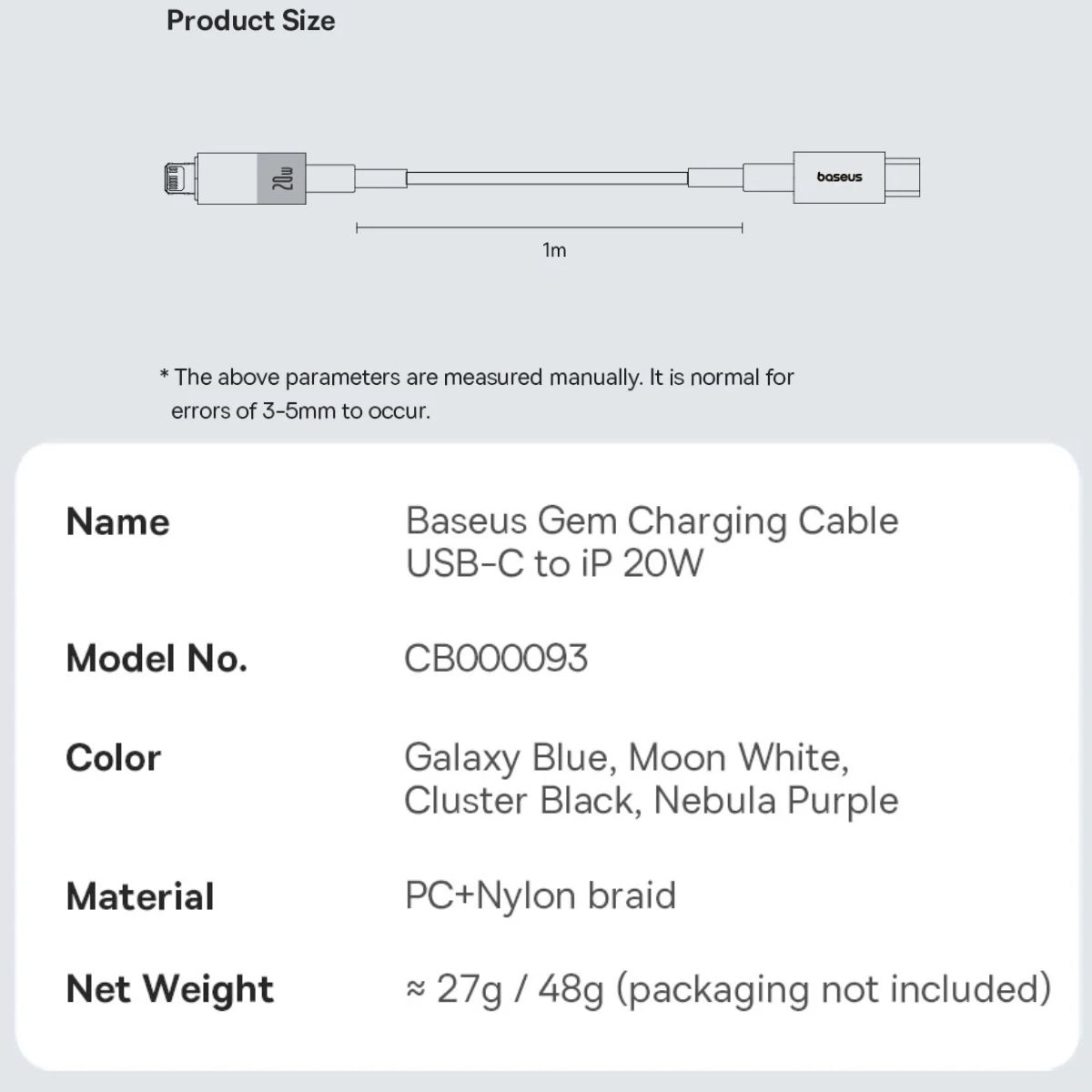 Mua tại TiktokGiới thiệu Cáp sạc nhanh và truyền dữ liệu Type C to Light-ning 20W Baseus Gem Charging Cable dài 1M và 2M