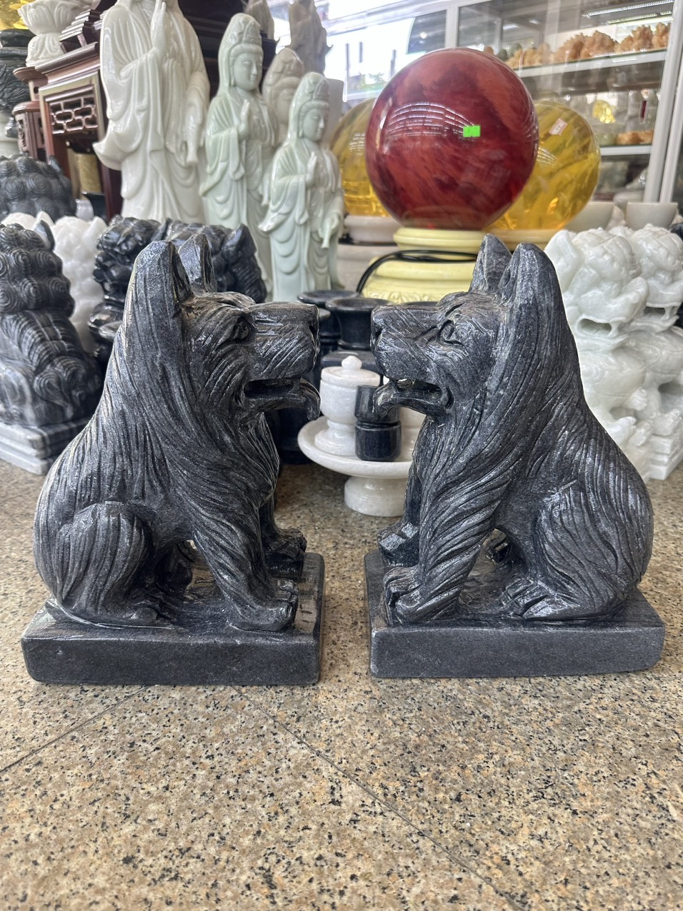 Chất liệu: Đá cẩm thạch đen Kích thước: Dài 22 cm x Rộng 12 cm x Cao 30 cm Khối lượng: 22 kg Chó đá có tên gọi khác là thạch linh cẩu là một
