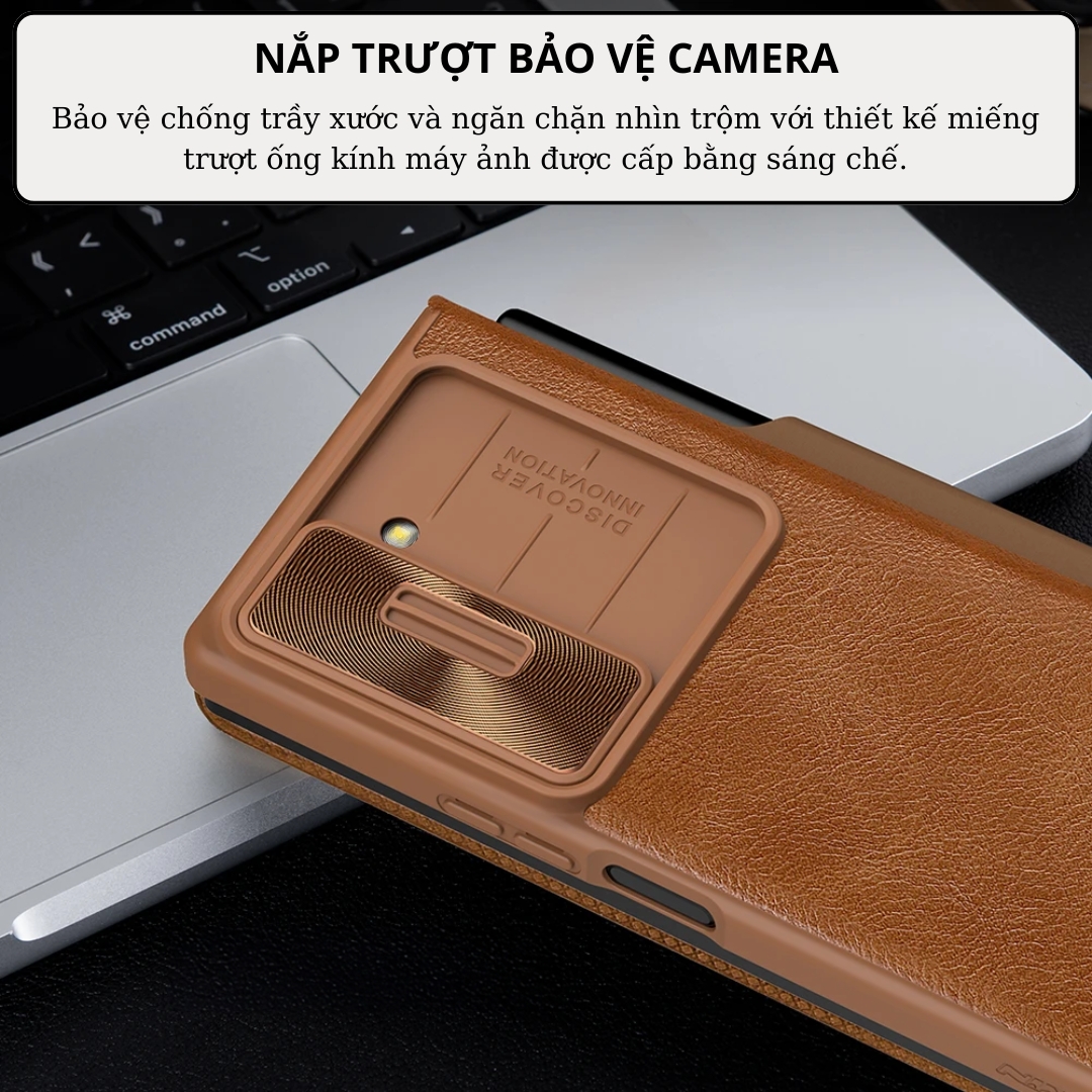 TRANG BỊ NẮP TRƯỢT BẢO VỆ CAMERA Case bao da chống sốc cho Samsung Galaxy Z Fold 6 trang bị nắp bảo vệ Camera và ngăn đựng S-Pen hiệu Nillkin Qin Pro thiết kế với nắp bảo vệ Camera  có thể kéo lên hay thả xuống tiện dụng và phần viền nhô lên 0.2mm giúp bảo vệ camera chống trầy, chống bụi cực kỳ tốt.