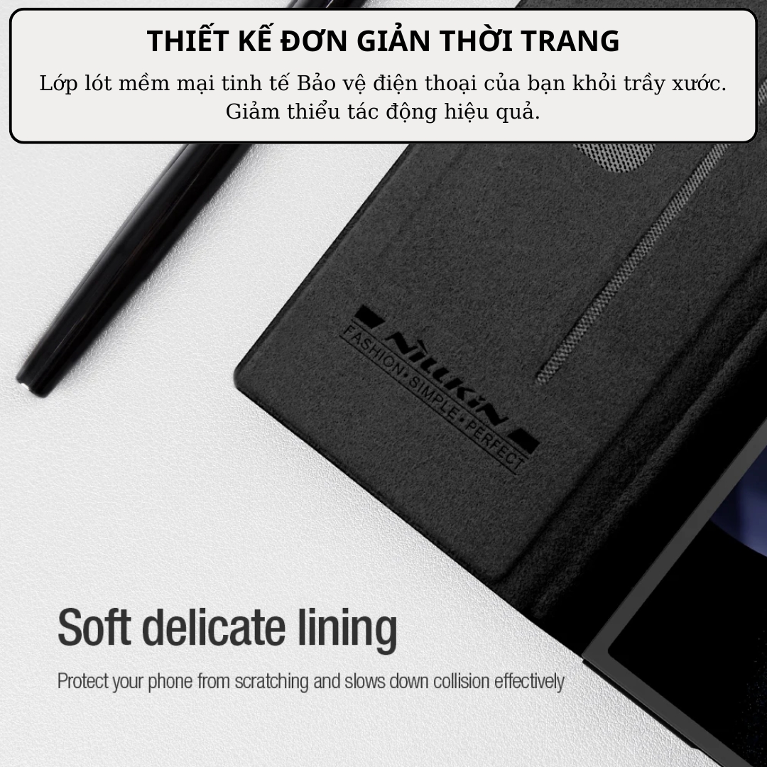 MẶT TRONG SIÊU MỀM MỊN Case bao da chống sốc cho Samsung Galaxy Z Fold 6 trang bị nắp bảo vệ Camera và ngăn đựng S-Pen hiệu Nillkin Qin Pro Với phần tiếp xúc 2 bên hông ốp được gia công tĩ mỉ giúp tăng độ chắc chắn cũng như khả năng cầm nắm, giúp cho nó khó rơi ra khi bạn cầm trên tay. Mặt trong mềm mịn tăng độ thẩm mỉ và bảo vệ máy khỏi trầy xước.