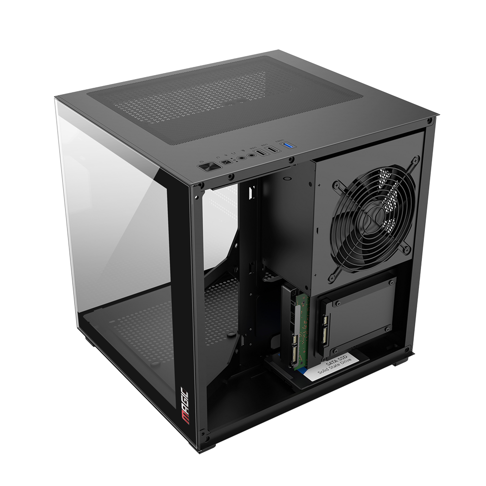 - Khung thân SPCC 0.5T sơn phủ đen - Kích thước nguồn ATX - Kích thước MB ATX - Mặt trước Kính cường lực - Mặt trên Vỏ bọc từ - Mặt trái Kính cường