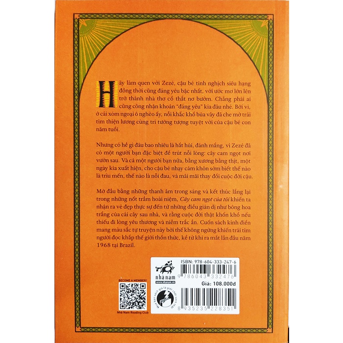 “Vị chua chát của cái nghèo hòa trộn với vị ngọt ngào khi khám phá ra những điều khiến cuộc đời này đáng số một tác phẩm kinh điển của Brazil.” - Booklist “Một cách nhìn cuộc sống gần như hoàn chỉnh từ con mắt trẻ thơ… có sức mạnh sưởi ấm và làm tan nát cõi lòng, dù người đọc ở lứa tuổi nào.” - The National Hãy làm quen với Zezé, cậu bé tinh nghịch siêu hạng đồng thời cũng đáng yêu bậc nhất, với ước mơ lớn lên trở thành nhà thơ cổ thắt nơ bướm. Chẳng phải ai cũng công nhận khoản “đáng yêu” kia đâu nhé. Bởi vì, ở cái xóm ngoại ô nghèo ấy, nỗi khắc khổ bủa vây đã che mờ mắt người ta trước trái tim thiện lương cùng trí tưởng tượng tuyệt vời của cậu bé con năm tuổi. Có hề gì đâu bao nhiêu là hắt hủi, đánh mắng, vì Zezé đã có một người bạn đặc biệt để trút nỗi lòng: cây cam ngọt nơi vườn sau. Và cả một người bạn nữa, bằng xương bằng thịt, một ngày kia xuất hiện, cho cậu bé nhạy cảm khôn sớm biết thế nào là trìu mến, thế nào là nỗi đau, và mãi mãi thay đổi cuộc đời cậu. Mở đầu bằng những thanh âm trong sáng và kết thúc lắng lại trong những nốt trầm hoài niệm, Cây cam ngọt của tôi khiến ta nhận ra vẻ đẹp thực sự của cuộc sống đến từ những điều giản dị như bông hoa trắng của cái cây sau nhà, và rằng cuộc đời thật khốn khổ nếu thiếu đi lòng yêu thương và niềm trắc ẩn. Cuốn sách kinh điển này bởi thế không ngừng khiến trái tim người đọc khắp thế giới thổn thức, kể từ khi ra mắt lần đầu năm 1968 tại Brazil. TÁC GIẢ: JOSÉ MAURO DE VASCONCELOS (1920-1984) là nhà văn người Brazil. Sinh ra trong một gia đình nghèo ở ngoại ô Rio de Janeiro, lớn lên ông phải làm đủ nghề để kiếm sống. Nhưng với tài kể chuyện thiên bẩm, trí nhớ phi thường, trí tưởng tượng tuyệt vời cùng vốn sống phong phú, José cảm thấy trong mình thôi thúc phải trở thành nhà văn nên đã bắt đầu sáng tác năm 22 tuổi. Tác phẩm nổi tiếng nhất của ông là tiểu thuyết mang màu sắc tự truyện Cây cam ngọt của tôi. Cuốn sách được đưa vào chương trình tiểu học của Brazil, được bán bản quyền cho hai mươi quốc gia và chuyển thể thành phim điện ảnh. Ngoài ra, José còn rất thành công trong vai trò diễn viên điện ảnh và biên kịch.