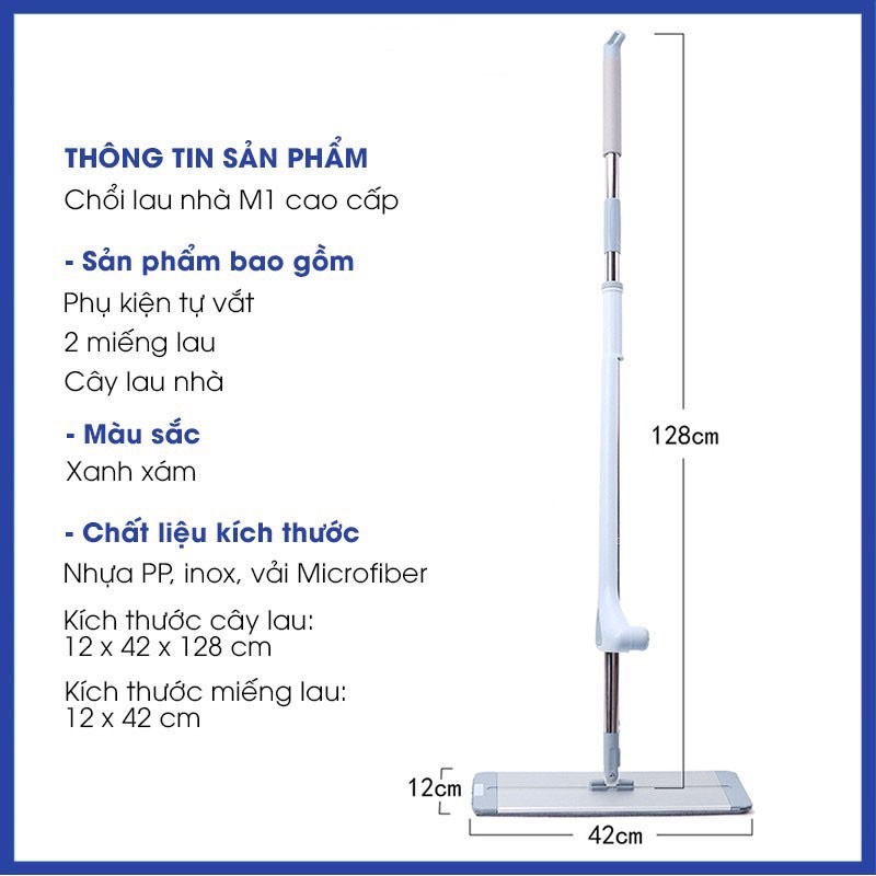 Cây Lau Nhà Vắt Phẳng Xanh 42cm - Kích thước: dài 129cm, rộng 42cm Đặc điểm sản phẩm - Cây lau nhà thông minh vắt phẳng được thiết kế theo công nghệ gạt nước hiện