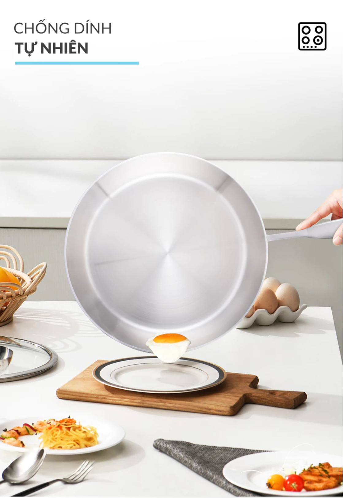 • Vật Liệu: inox 316 (Lòng chảo), 431 ( thân chảo bên ngoài để bắt từ), 201 (tay cầm)