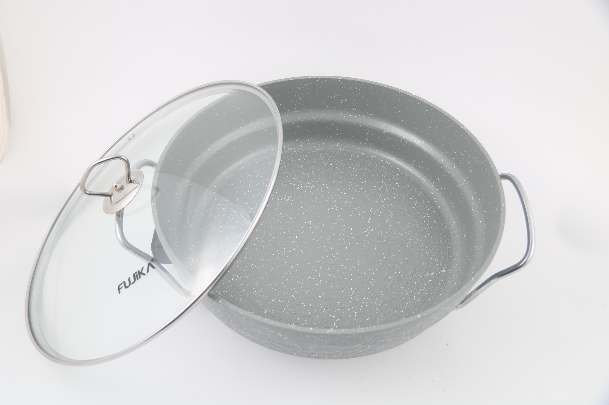 Khác với những chiếc nồi lẩu rẻ tiền ngoài thị trường, nồi lẩu đa năng FUJIKA được sản xuất theo dây chuyền công nghệ Nhật Bản với chất liệu nhôm nguyên chất, bền đẹp và an toàn tuyệt đối. Bên trong được phủ lớp vân đá hoa cương giúp tăng độ chống dính lên gấp 2 lần chảo thông thường.