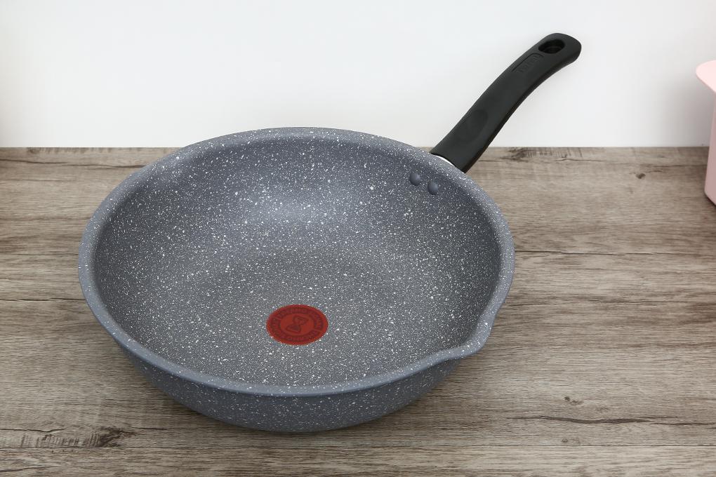 Ở giữa lòng chảo chống dính Tefal có biểu tượng đồng hồ cát, khi biểu tượng này chuyển sang màu đỏ sẫm, chảo đã đạt nhiệt độ lý tưởng, bạn có thể cho nguyên liệu vào chiên xào ngay.