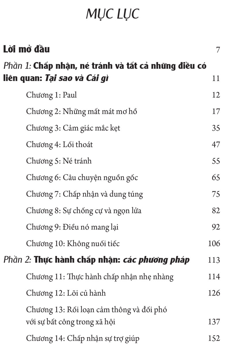 Cuốn sách được chia làm hai phần. Phần một sẽ đưa bạn đọc xem xét và tìm hiểu thế nào là chấp nhận, tại sao sự chấp nhận là quan trọng và cung cấp cho độc giả những ví dụ lâm sàng của những cá nhân khác - những người đang phải vật lộn với sự chấp nhận và hành trình sau đó của họ. Phần thứ hai của cuốn sách sẽ tập trung vào cách thực hành chấp nhận qua các bài thực hành cụ thể, cũng như cách để đối phó với những thử thách có thể xảy ra trên hành trình của bạn.