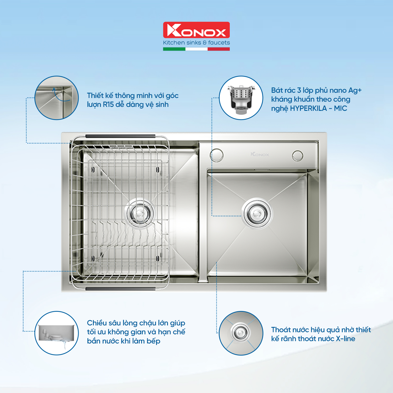 Sản phẩm thiết kế sâu lòng, người dùng linh hoạt trong việc lựa chọn hố chậu theo nhu cầu sử dụng, giúp tiết kiệm nước với thiết kế 2 hố chậu lệch.