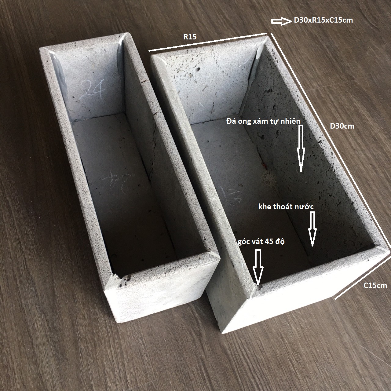 • Chậu trồng cây hình chữ nhật được làm từ chất liệu đá ong xám tự nhiên hay còn gọi đá núi lửa, loại đá cực tốt cho cây trồng giúp giữ ẩm cho đất và có các lỗ thông khí đất hấp thụ dinh dưỡng cho cây tốt hơn