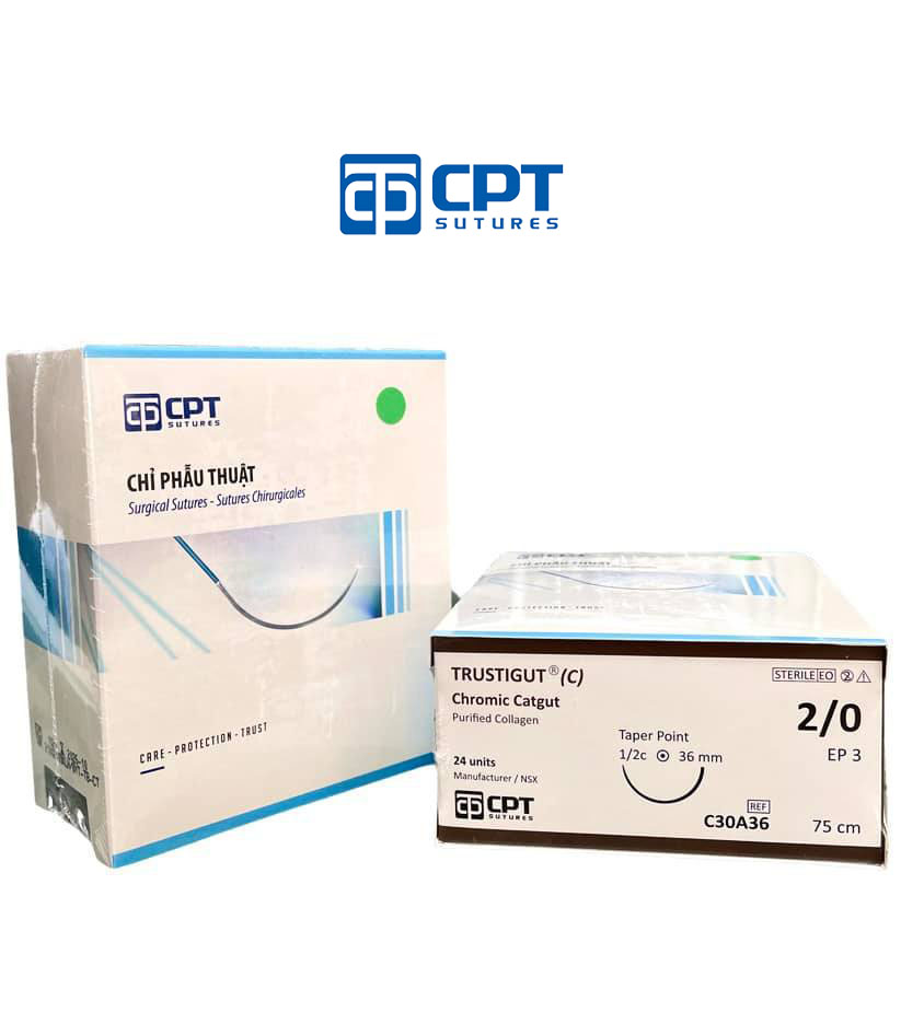 Mua tại TiktokChỉ phẫu thuật tự tiêu tan chậm CPT Trustigut (C) Chromic Catgut: size cỡ chỉ: 2/0 USP, dài 75 cm, kim tròn 1/2c, dài 36 mm, mã hàng: C30A36. Quy cách đóng gói: 24 tép. THÀNH PHẦN: