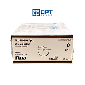 - Chỉ phẫu thuật tự tiêu tan chậm CPT Trustigut (C) Chromic Catgut: size cỡ chỉ: số 0 USP, dài 75 cm, kim tròn 1/2c, dài 36 mm, mã hàng: C40A36. Quy cách đóng gói: 24 tép. THÀNH PHẦN: