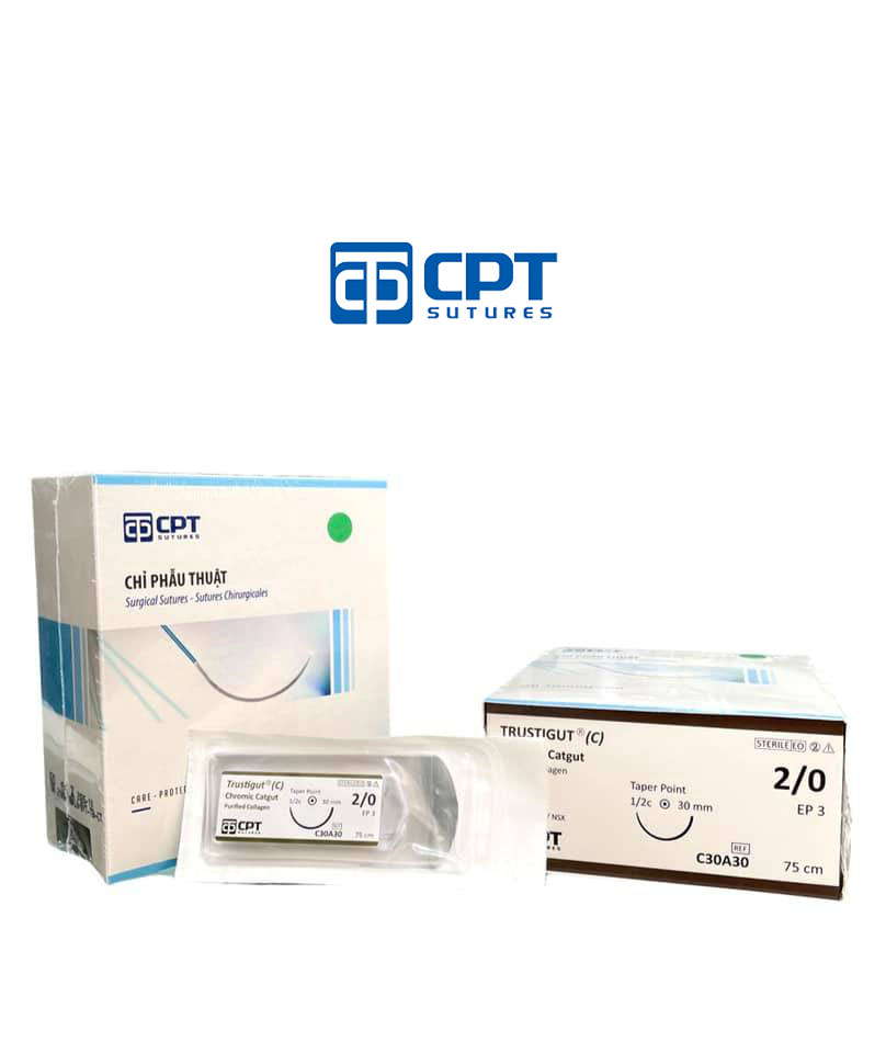 Chỉ phẫu thuật tự tiêu tan chậm CPT Trustigut (C) Chromic Catgut: size cỡ chỉ: 2/0 USP, dài 75 cm, kim tròn 1/2c, dài 30 mm, mã hàng: C30A30. Quy cách đóng gói: 24