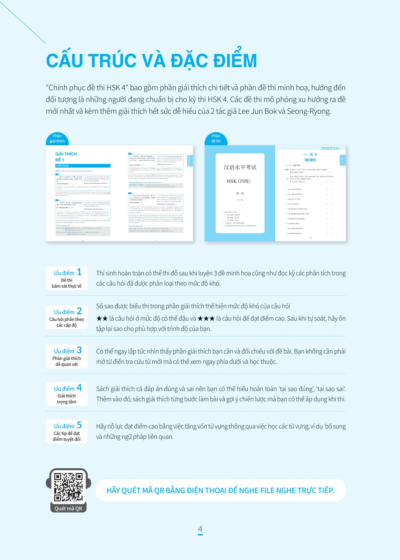Cuốn sách "Chinh phục đề thi HSK 4" được tổng hợp với 3 bài thi thử, phân tích các câu hỏi được đưa ra trong bài thi HSK gần đây và chọn ra những câu hỏi trọng tâm. Bên cạnh đó cuốn sách cũng giải thích chi tiết các kiến thức cốt lõi trong các đề thi gần nhất với đề thi thật cũng như các câu hỏi học sinh dễ mắc lỗi.