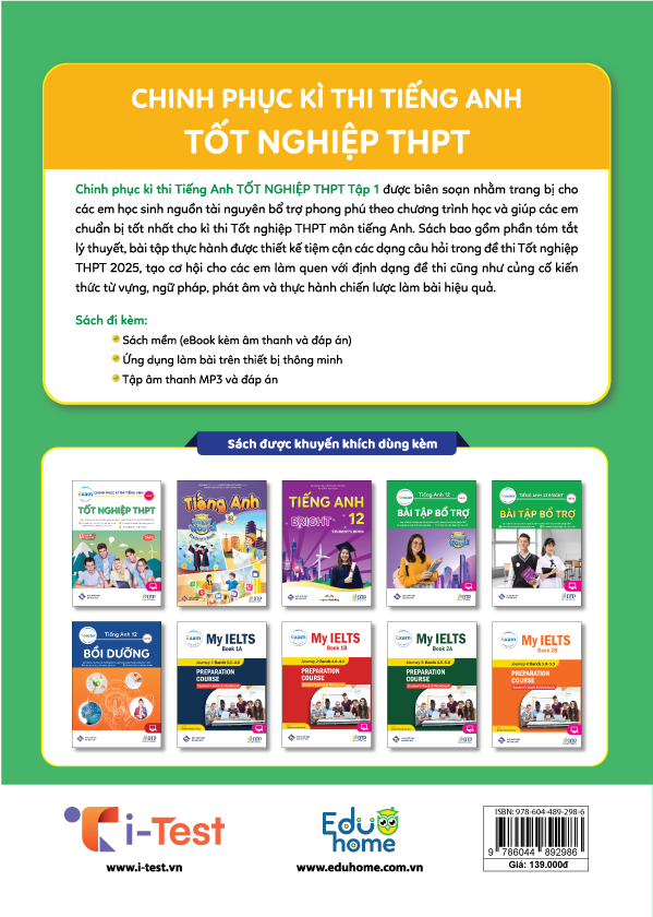 Mua tại TiktokChinh phục kì thi Tiếng Anh - Tốt nghiệp THPT tập 1 được biên soạn nhằm trang bị cho các em học sinh nguồn tài nguyên bổ trợ phong phú theo chương trình học và giúp các em chuẩn bị tốt nhất cho kì thi tuyển sinh Tốt nghiệp THPT môn tiếng Anh. Sách bao gồm phần tóm tắt lý thuyết và bài tập thực hành được thiết kế bám sát các dạng câu hỏi trong đề thi tuyển sinh Tốt nghiệp THPT 2025, tạo cơ hội cho các em làm quen với các định dạng đề thi cũng như củng cố kiến thức từ vựng, ngữ pháp, phát âm và thực hành các chiến lược làm bài một cách hiệu quả.