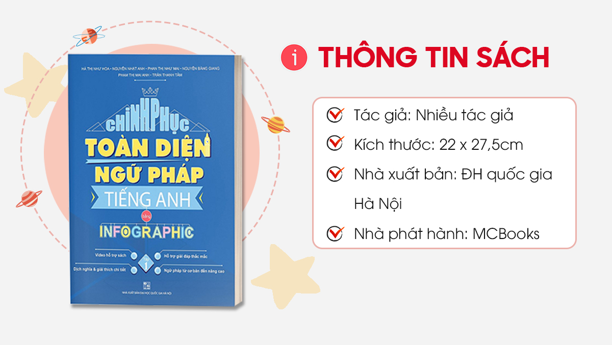 - Người đi làm cần bổ sung kiến thức ngữ pháp phục vụ trong công việc. MCbooks hi vọng rằng cuốn sách Chinh phục toàn diện Ngữ pháp tiếng Anh bằng Infographic sẽ là một tài liệu phong phú, hỗ trợ toàn diện và nâng cao trình độ ngữ pháp tiếng Anh từ cơ bản đến nâng cao.