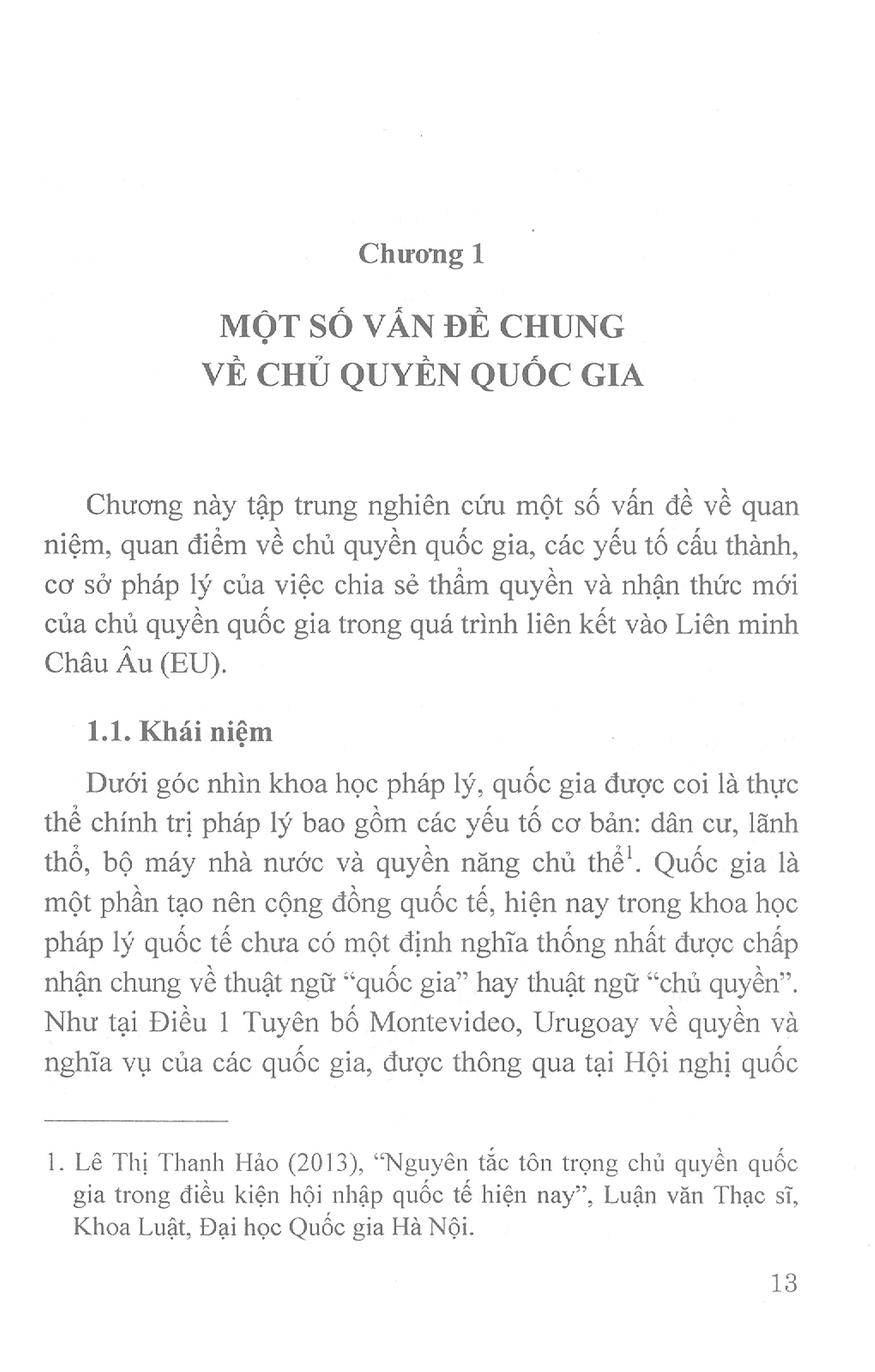 Chương 1: Một số vấn đề chung về chủ quyền quốc gia. Chương này tập trung phân tích quan niệm, nhận thức về chủ quyền quốc gia; nhận thức mới về chủ quyền quốc gia; một số lý thuyết về chia sẻ chủ quyền giải thích quá trình hội nhập khu vực; hội nhập khu vực và chủ quyền quốc gia và cơ sở pháp lý chia sẻ chủ quyền quốc gia trong quá trình liên kết ở Liên minh Châu Âu.