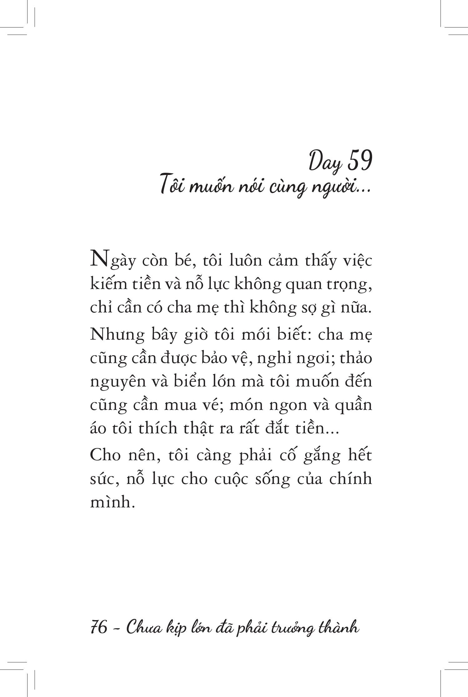 Nếu bạn đang trải qua giai đoạn lạc lõng và cô đơn như vậy, hãy để “Chưa kịp lớn đã phải trưởng thành” làm một người bạn ở bên, xoa dịu tổn thương và gửi tặng bạn đôi điều khích lệ. Mỗi trang sách đều là một lá thư nhắn nhủ bạn về sự đặc biệt của bản thân, về những nỗ lực hoàn thiện không ngừng nghỉ trong thế giới của người trưởng thành.