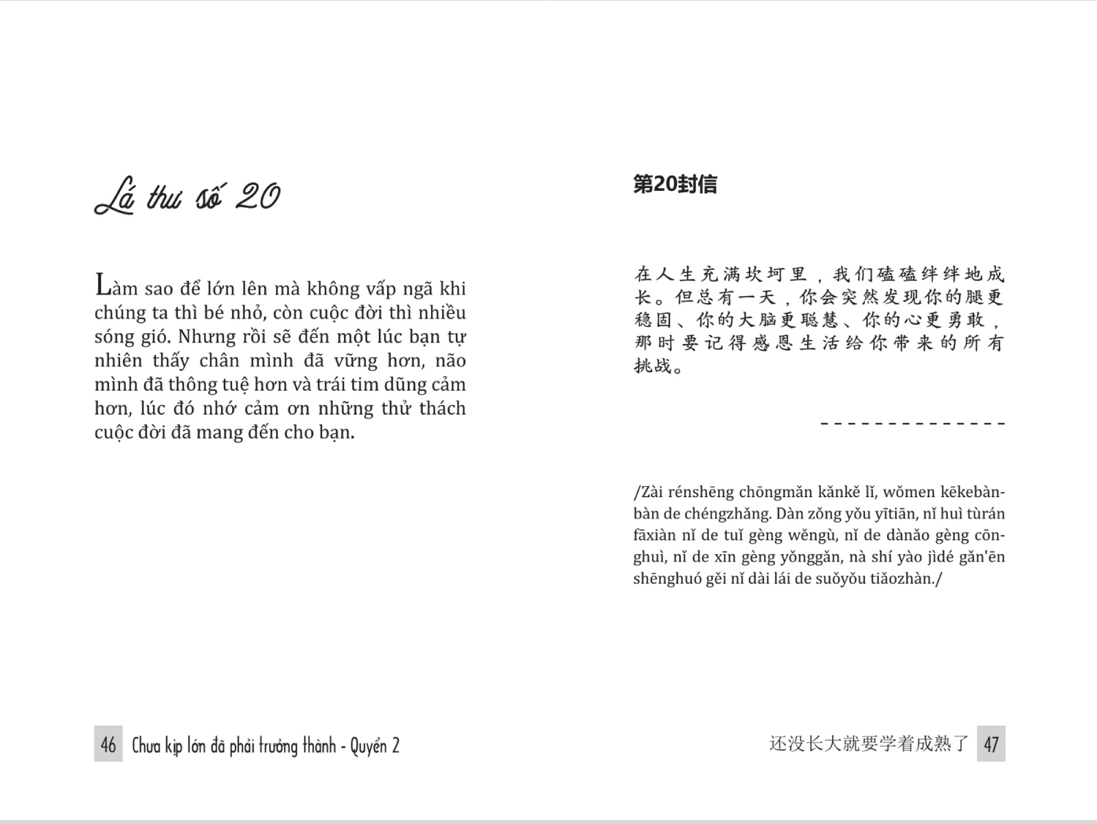 Cuốn sách là những lá thư tâm tình nhẹ nhàng, được viết bằng 2 ngôn ngữ tiếng Việt và tiếng Trung. Giúp bạn không còn cô đơn trên hành trình tập lớn, đồng thời nâng cao khả năng ngoại ngữ cho tuổi trẻ thêm rộng mở và trọn vẹn.