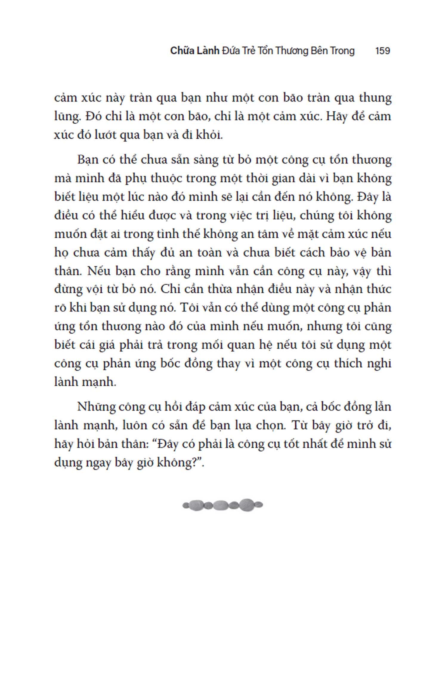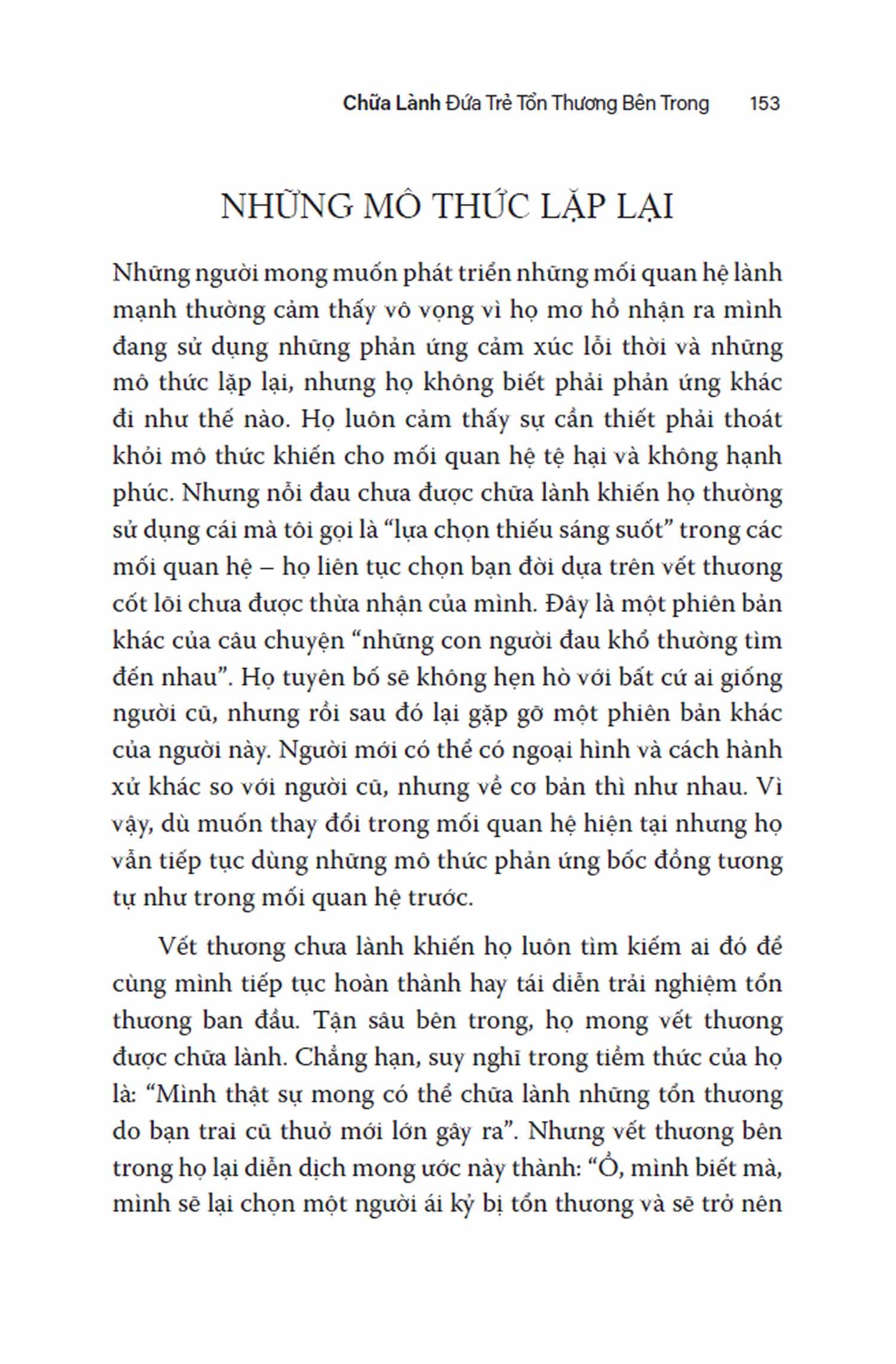 Chữa Lành Đứa Trẻ Tổn Thương Bên Trong “Chữa lành đứa trẻ tổn thương bên trong” Vượt qua vết thương thời thơ ấu để sống cuộc đời trọn vẹn Có thể bạn từng hỏi bản thân những câu hỏi sau đây: “Sao những chuyện tệ hại này cứ xảy đến với tôi?”; “Sao tôi cứ mãi thấy tức giận, đau khổ, trống rỗng và không trọn vẹn?”; “Làm sao để vết thương lòng từ thơ ấu không đeo đẳng tôi đến suốt đời?” Nếu bạn đang trên con đường chữa lành những vết thương tâm hồn và bạn đang tìm kiếm một lộ trình chi tiết, dễ hiểu, “Chữa lành đứa trẻ tổn thương bên trong” (“Healing Your Lost Inner Child”) chính là cuốn sách bạn cần. Cuốn sách được đúc kết từ 20 năm kinh nghiệm trị liệu cùng với trải nghiệm cá nhân của tác giả Robert Jackman – một chuyên gia trị liệu tâm lý được chứng nhận và là một tác giả sách bán chạy. Theo Robert Jackman, khái niệm “đứa trẻ tổn thương bên trong” chính là phần bên trong ta còn lưu giữ ký ức cảm xúc từ những trải nghiệm tổn thương trong quá khứ, như bị lạm dụng, bỏ mặc, hoặc những chấn thương tâm lý khác. Trong bốn chương đầu, tác giả mô tả sự hình thành những vết thương tâm hồn, giới thiệu các nhân tố kích hoạt và cách mà những ngòi nổ này kích hoạt đứa trẻ tổn thương bên trong ở tuổi trưởng thành, đẩy ta vào những vòng lặp của phản ứng bốc đồng và làm cho các mối quan hệ hiện tại trở nên tệ hại. Quy trình chữa lành được giải thích cụ thể hơn ở phần sau, có sự tham gia của “phần nội tâm lành lặn, chín chắn” bên trong mỗi người – mà Jackman gọi là “phần người lớn có trách nhiệm”, hay “phần trưởng thành”. Thông qua các bài tập và câu chuyện của những người đã được chữa lành cũng như của chính tác giả, cuốn sách hướng dẫn làm thế nào để thấu hiểu “đứa trẻ tổn thương” bên trong chính m.ình và cách để kết nối phần nội tâm này với “phần trưởng thành”. Chẳng hạn như nhìn lại dòng sự kiện thời thơ ấu, viết thư trao đổi giữa phần trưởng thành và phần tổn thương, liên hệ những phản ứng bốc đồng trong hiện tại với nguyên nhân trong quá khứ… Việc viết những lá thư chữa lành qua lại với chính m.ình là một cách tuyệt vời để nhanh chóng làm bộc lộ những cảm xúc và kết nối với phần tổn thương bên trong bạn. Bạn đọc cũng sẽ hiểu cách mà “phần người lớn có trách nhiệm” có thể phát triển một bộ công cụ hồi đáp mới, tích cực hơn, thay thế cho những kiểu phản ứng cũ của đứa trẻ tổn thương bên trong. Thiết lập các ranh giới lành mạnh là một nhiệm vụ quan trọng khác của “phần trưởng thành”. Theo Robert Jackman, ranh giới – khả năng nói “không”, sự cam kết về điều ta có thể và không thể chấp nhận – sẽ tạo một môi trường an toàn cho đứa trẻ bị tổn thương, giúp phần nội tâm này không còn phải phòng vệ, sợ hãi hay phản ứng bốc đồng… Tác giả viết: “Hệ thống ranh giới hiệu quả là chất keo kết dính giúp cho quy trình chữa lành được thực hiện đồng bộ”. Một khi đi qua quy trình chữa lành, bạn sẽ dần thấy m.ình không còn dễ bị kích động theo cách cũ nữa, mà bình tĩnh, tự do và nhẹ nhõm hơn. Phần đứa trẻ khổ đau bên trong bạn cũng sẽ dần hợp nhất với phần con người trưởng thành, giúp bạn chào đón một bản thể trọn vẹn, chân thật nhất của m.ình. Từ đây, bạn là người sáng tạo nên cuộc đời m.ình - thay vì chỉ hành động hay phản ứng một cách vô thức do những nỗi đau trong quá khứ. Bên cạnh hiểu biết và kinh nghiệm của bản thân, “Chữa lành đứa trẻ tổn thương bên trong” còn kế thừa những học thuyết, công trình nghiên cứu của nhà tâm lý học Carl Jung, tiến sĩ Eric Berne… cũng như các tác giả đương đại nổi tiếng. Xuyên suốt cuốn sách, Robert Jackman sử dụng văn phong gần gũi, nhẹ nhàng, tràn đầy sự thấu hiểu và cảm thông. Ông thường xuyên dùng những hình ảnh ẩn dụ khi chia sẻ các câu chuyện từ các thân chủ (được giấu tên) lẫn từ chính cuộc đời của m.ình để làm sáng tỏ những kiến thức chuyên sâu. Đặc biệt, nhiều bài thực hành và những câu hỏi tự vấn được sắp xếp có hệ thống sẽ giúp việc đọc sách như một quá trình tự soi tỏ bản thân thật nhẹ nhàng; quy trình chữa lành nhờ đó cũng trở nên thật cá nhân và hiệu quả với từng bạn đọc. “Chữa lành đứa trẻ tổn thương bên trong” lọt top 5 hạng mục sách tham vấn y tế (Medical Counseling) trên Amazon và đã được dịch sang 10 ngôn ngữ trên thế giới. Đây là nguồn tham khảo thiết yếu cho bất cứ ai cần chữa lành, cũng như sẽ giúp ích không ít cho các chuyên gia trị liệu tâm lý. Lời khen tặng dành cho cuốn sách