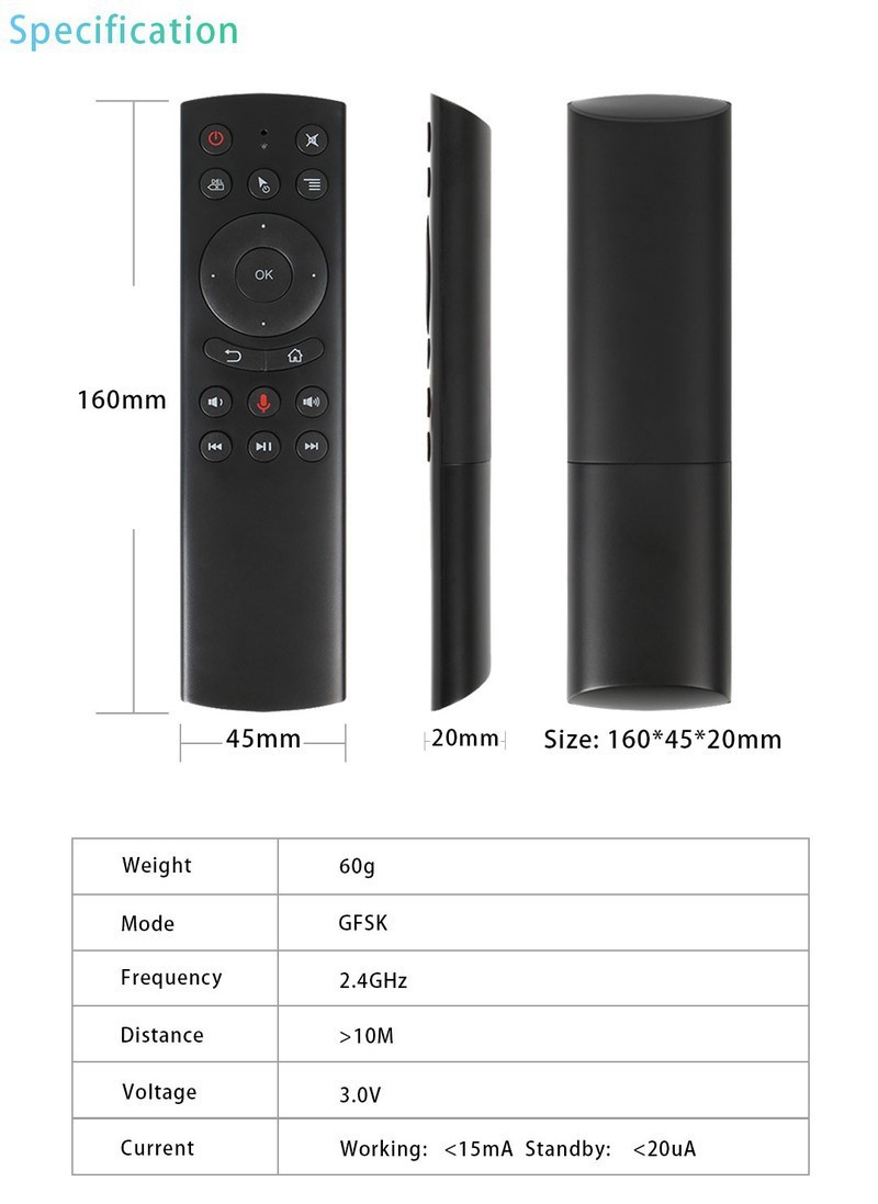 - Dùng tốt trên các 6.0 trở lên, đặc biệt là với HĐH AndroidTV Model: g20s chuột bay Chức năng hoạt động: Điều khiển điều hướng, cử chỉ chuột bay Tìm kiếm giọng nói 1 chạm (cơ chế bấm nhả ra lệnh) Lưu ý: Điều khiển giọng nói theo cơ chế Voice Assistant Có thể học lệnh 1 nút nguồn Tương thích với nhiều thiết bị sử dụng HĐH Android, máy tính Lưu ý: