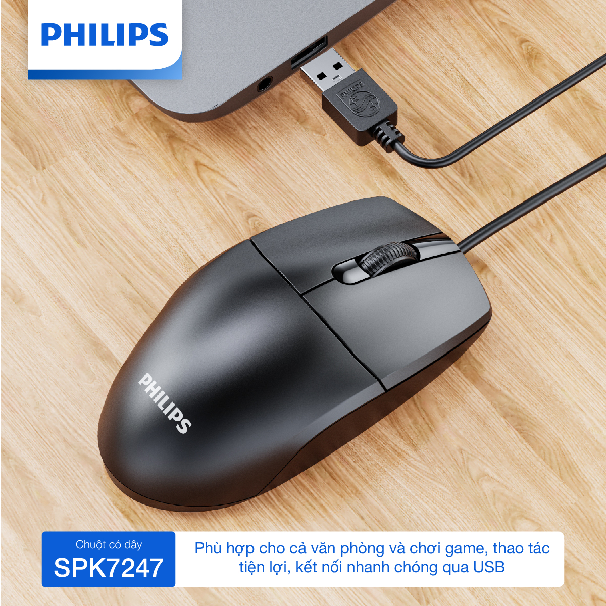 ️Chuột có dây Philips SPK7247 – Cắm là dùng, bền bỉ tiện lợi Thiết kế đối xứng – thoải mái cho cả tay trái và phải Độ phân giải 1200 DPI – thao tác mượt