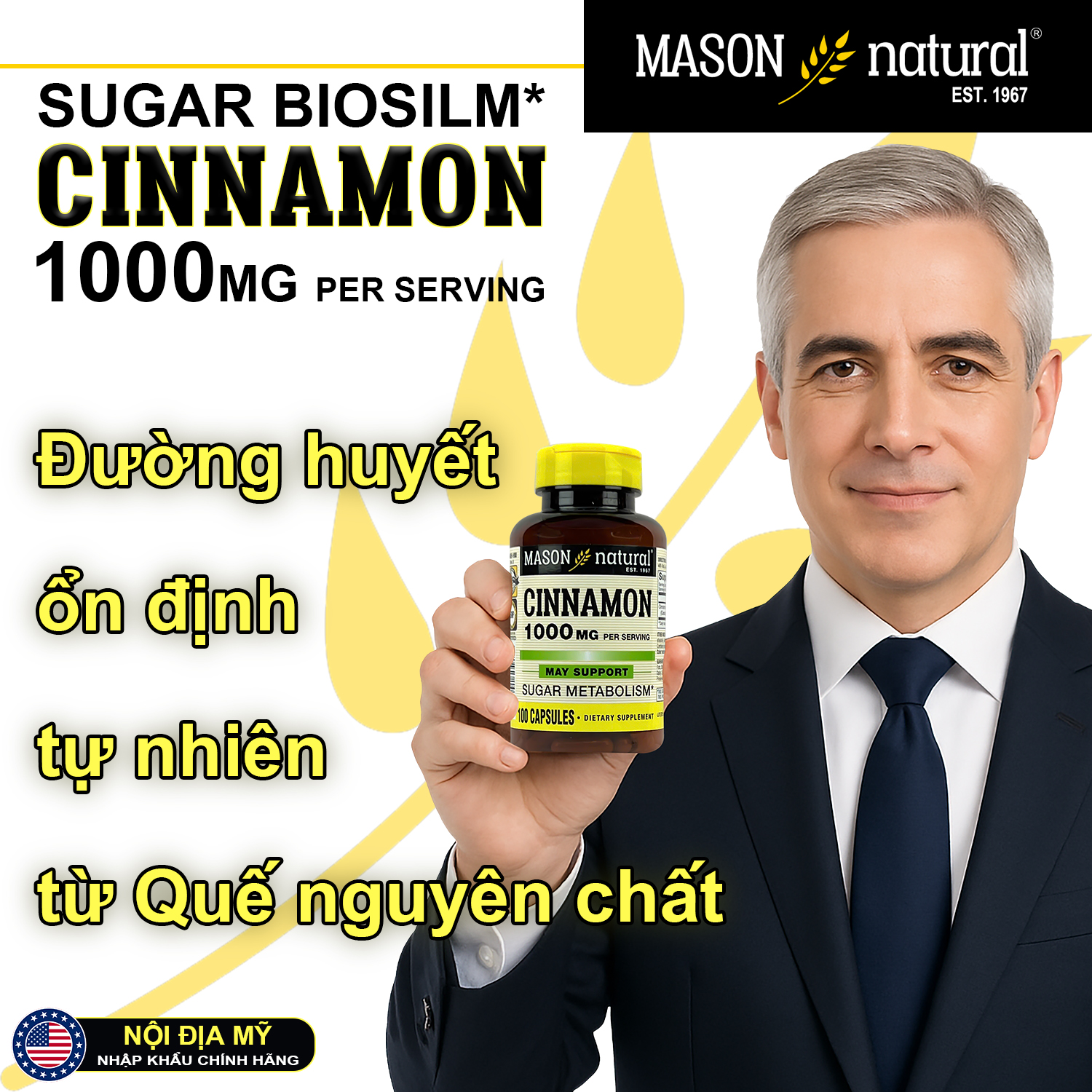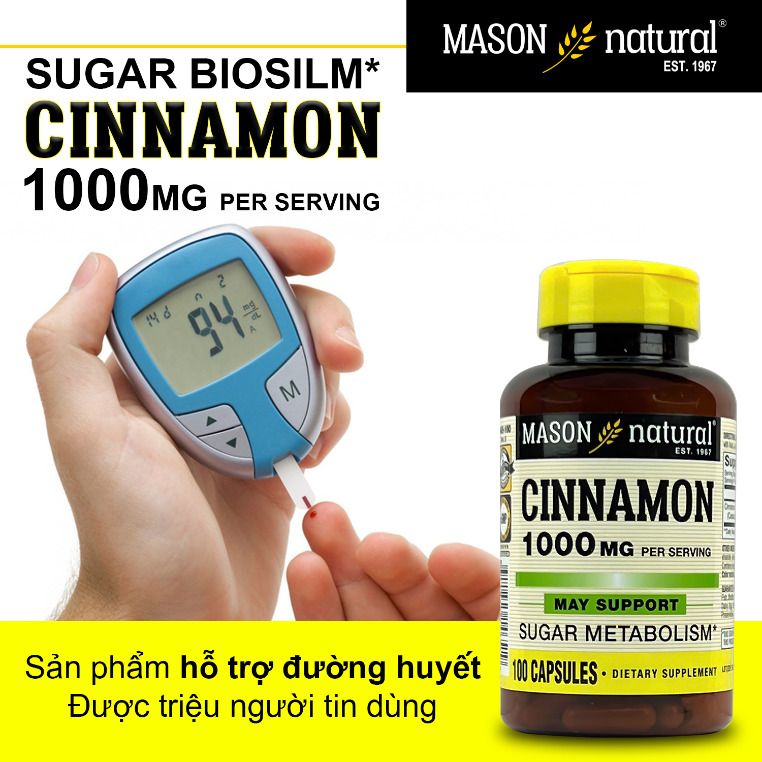 MASON CINNAMON 1000MG - ỔN ĐỊNH ĐƯỜNG HUYẾT TỰ NHIÊN - SỐNG KHỎE MỖI NGÀY! Chiết xuất quế nguyên chất 1000mg - Hỗ trợ kiểm soát đường huyết - An toàn cho sức khỏe Mason