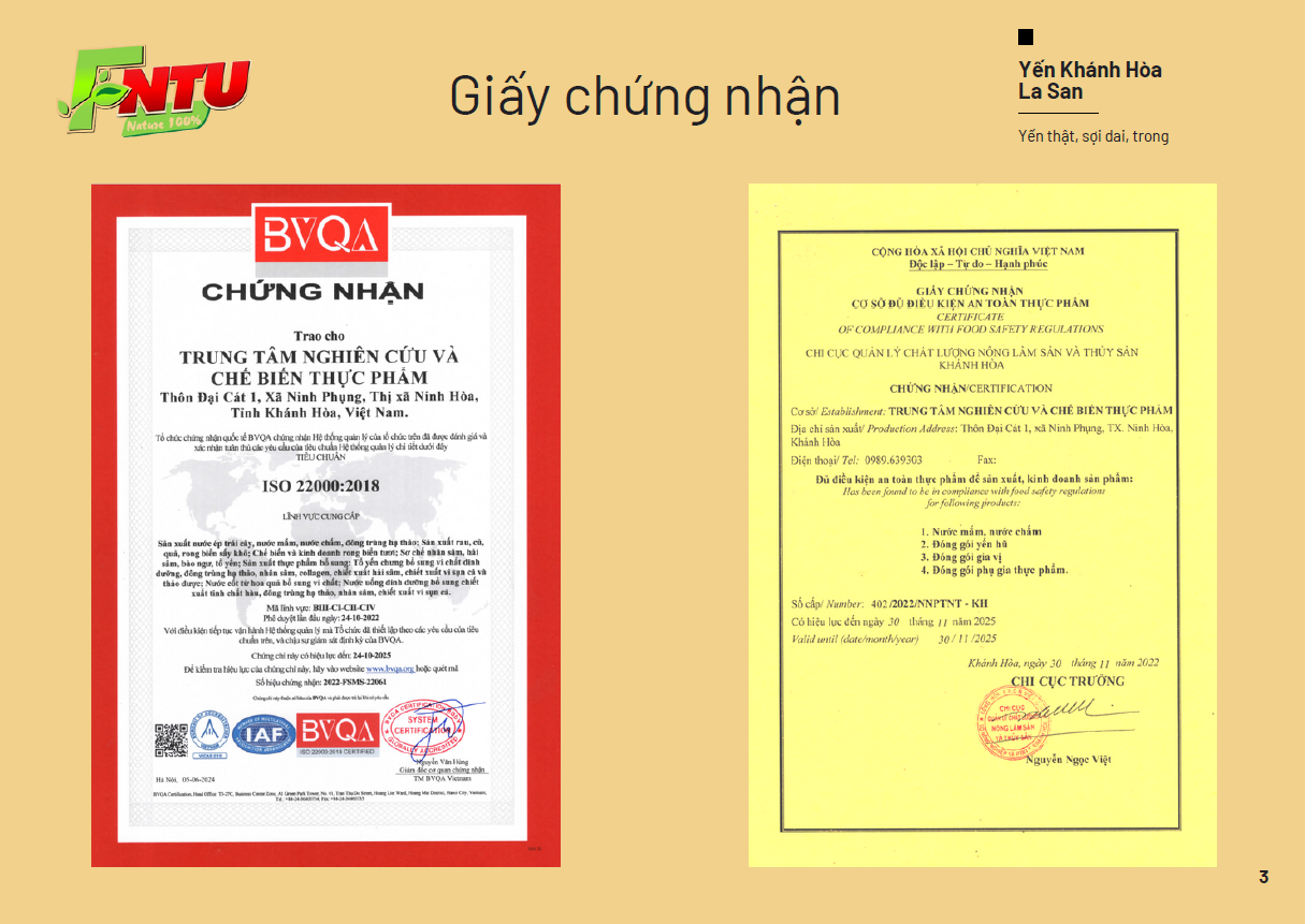 Yến Khánh Hòa La San Đường Phèn: được chế biến theo phương pháp truyền thống, kết hợp với công nghệ hiện đại trên dây chuyền thiết bị tiên tiến từ châu Âu. Điều này không chỉ giữ trọn vẹn hương vị tự nhiên mà còn bảo toàn tối đa các dưỡng chất quý giá có trong yến.