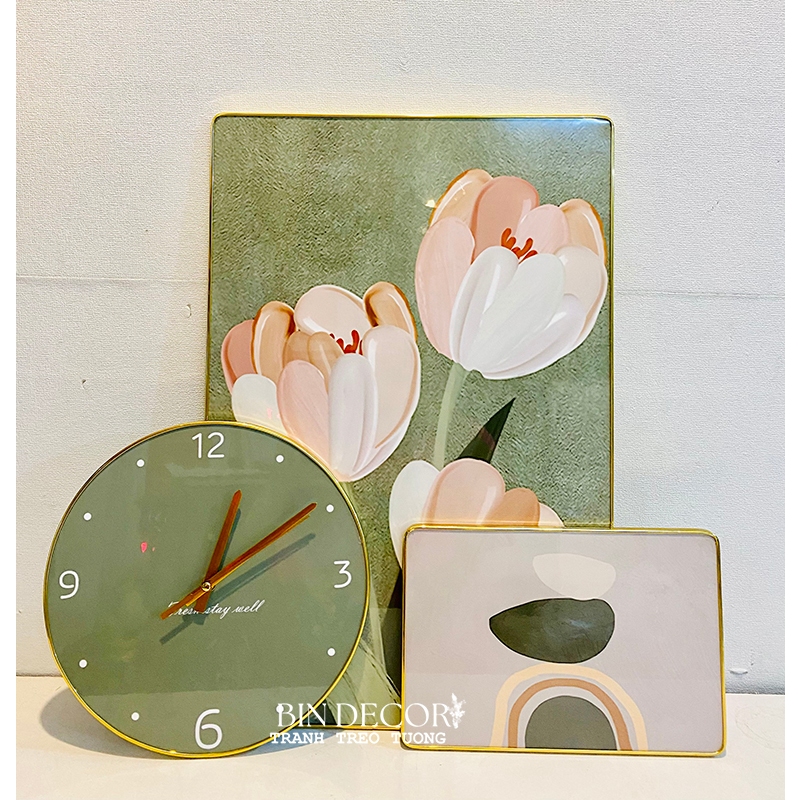 ✨(CÓ ẢNH THẬT) Tranh đồng hồ tráng gương hoa tulip bộ 3 tranh bo viền kèm đinh và pin