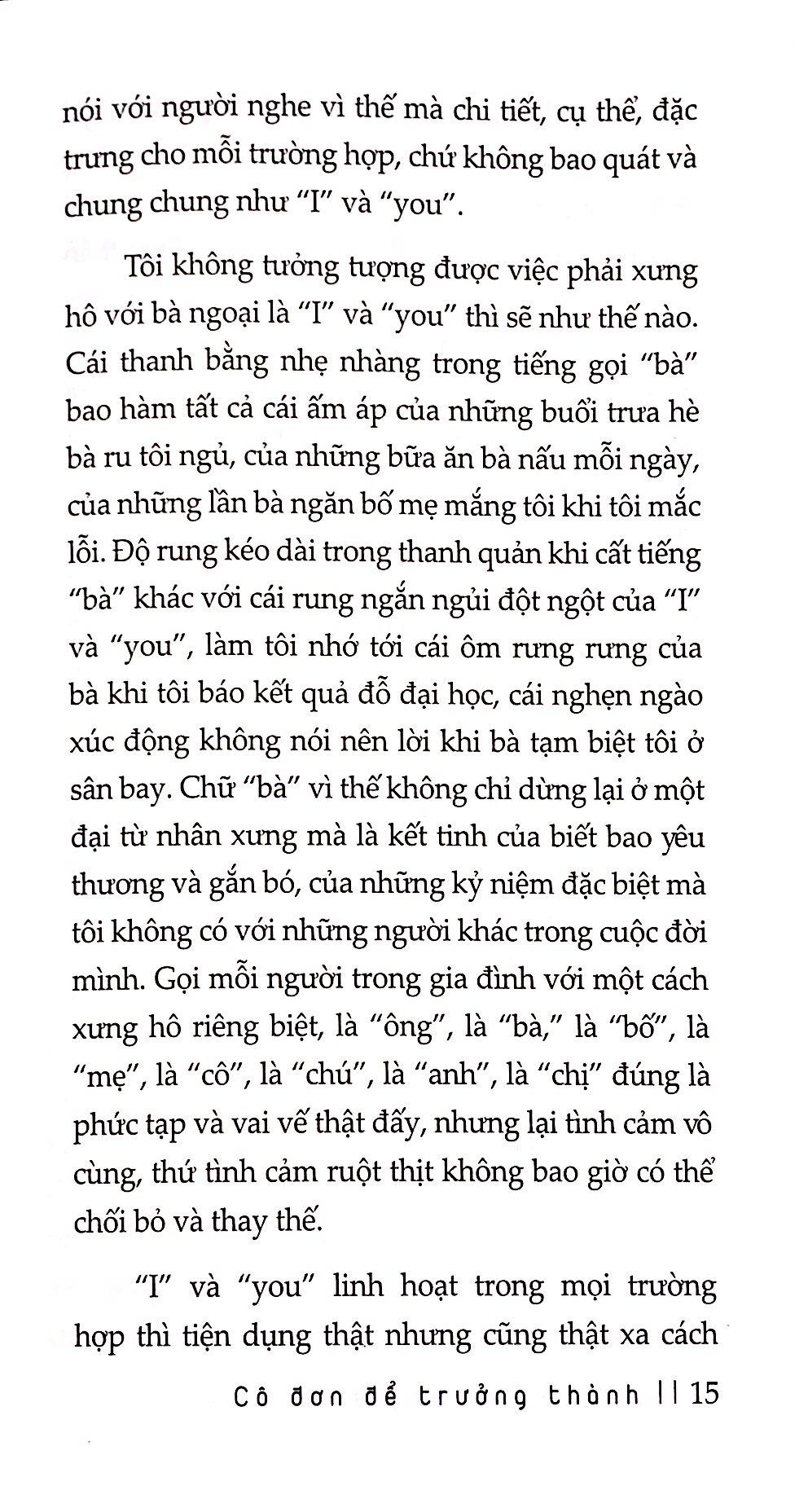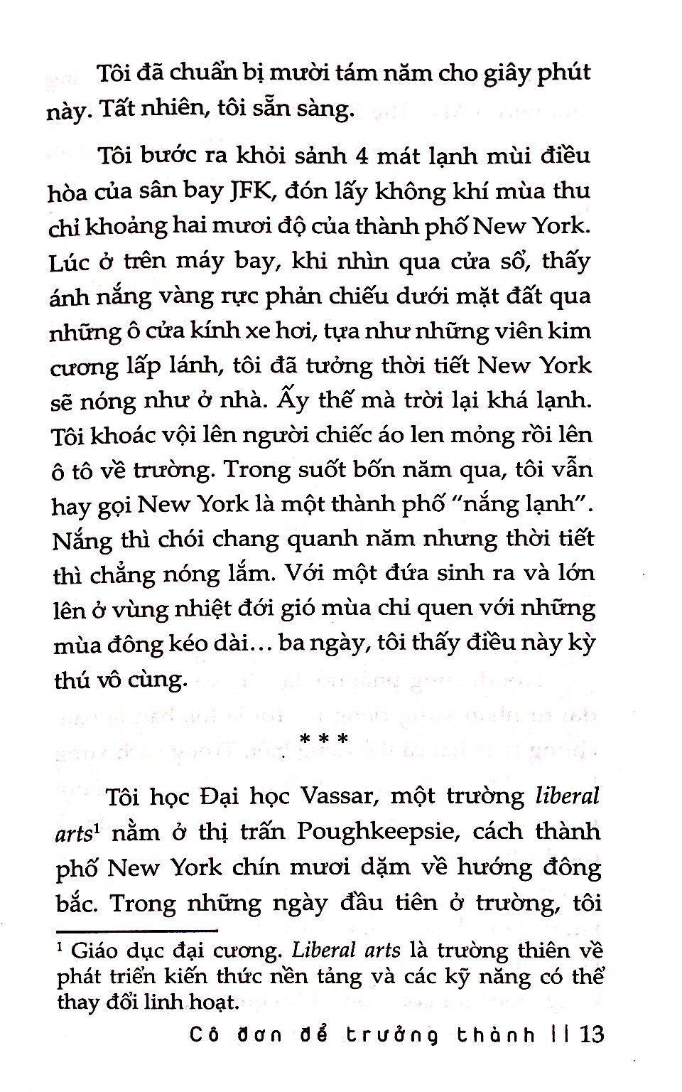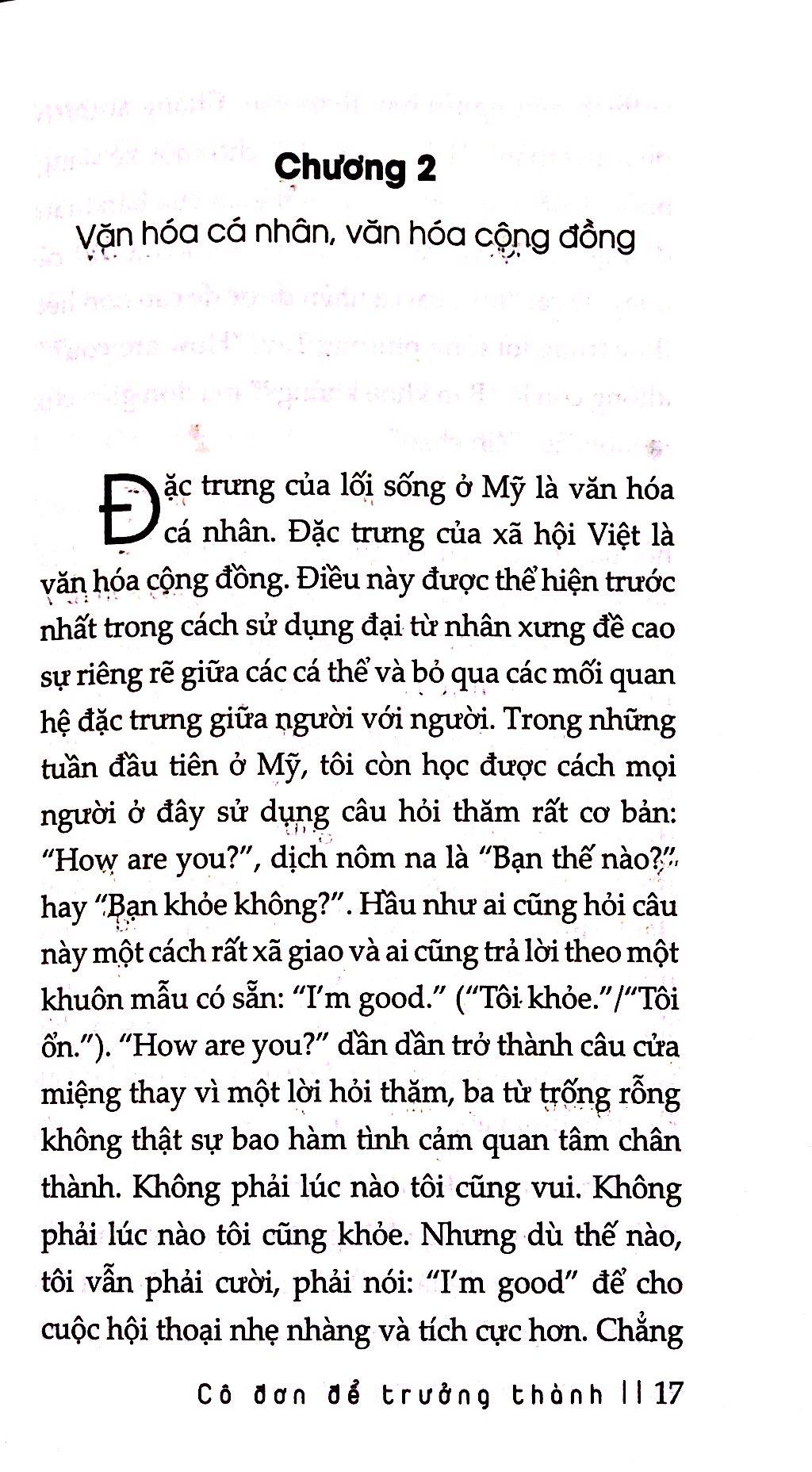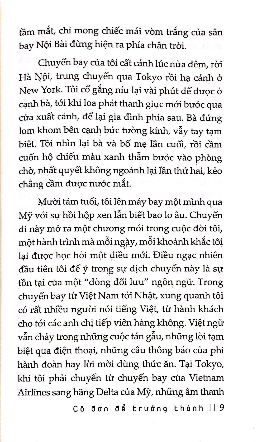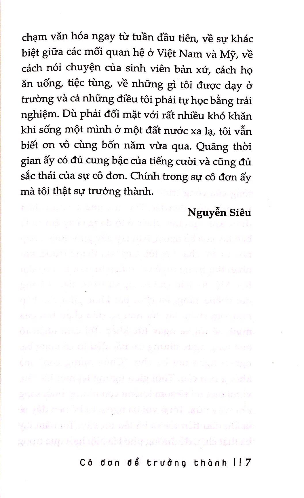 Mua tại TiktokCô Đơn Để Trưởng Thành Bốn năm du học Mỹ của tôi đọng lại trong những trang văn này, những ghi chép về sự va chạm văn hóa ngay từ tuần đầu tiên, về sự khác biệt giữa các mối quan hệ ở Việt Nam và Mỹ, về cách nói chuyện của sinh viên bản xứ, cách họ ăn uống, tiệc tùng, về những gì tôi được dạy ở trường và cả những điều tôi phải tự học bằng trải nghiệm. Dù phải đối mặt với rất nhiều khó khăn khi sống một mình ở một đất nước xa lạ, tôi vẫn biết ơn vô cùng bốn năm vừa qua. Quãng thời gian ấy có đủ cung bậc của tiếng cười và cũng đủ sắc thái của sự cô đơn. Chính trong sự cô đơn ấy mà tôi thật sự trưởng thành.
