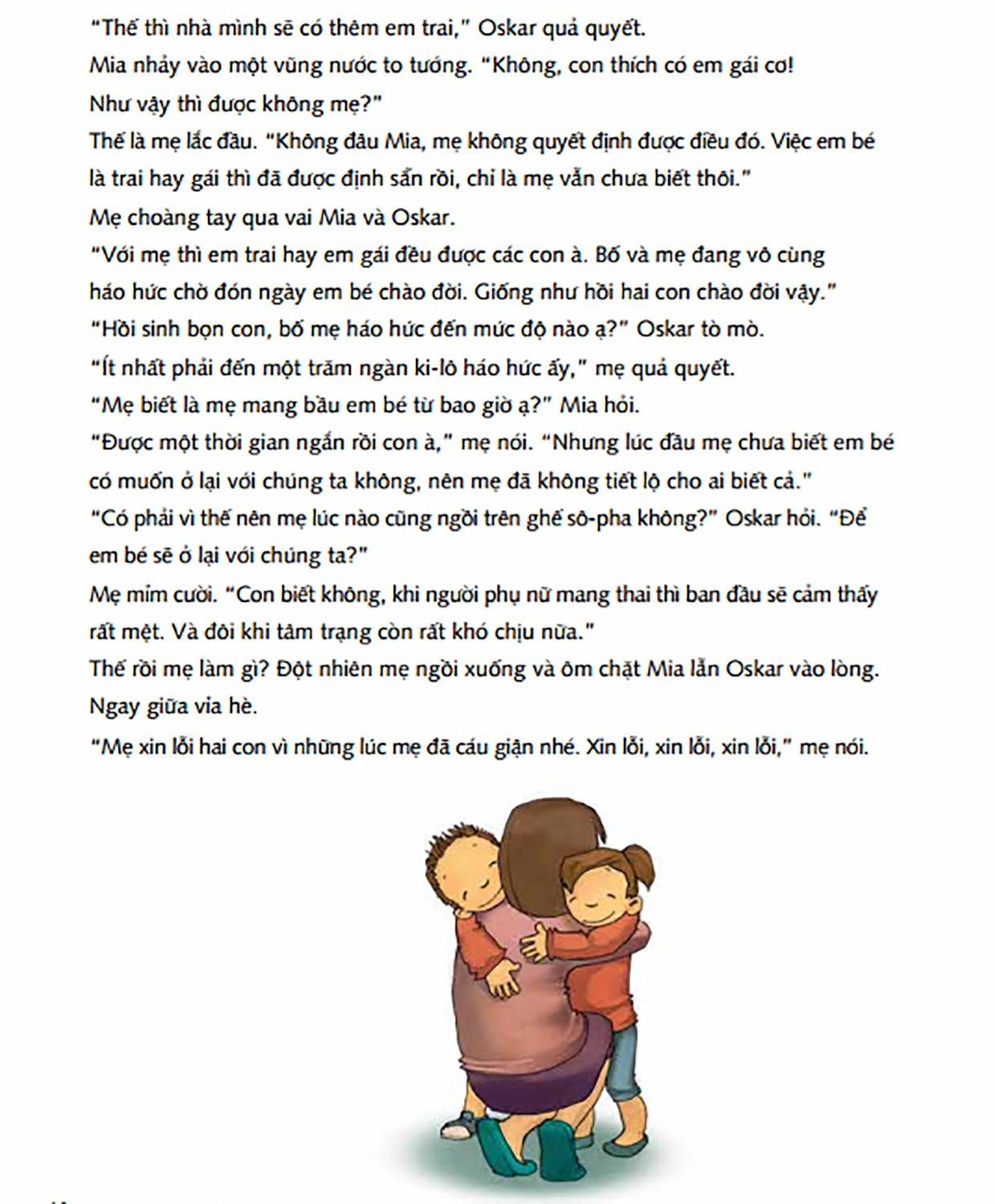 Cũng như những thắc mắc của Mia và Oskar trong cuốn sách này. Mia và Oskar sắp có em. Những điều đang diễn ra trong bụng mẹ thật là thú vị, không thể tin được luôn. Làm thế nào mà một em bé lại ở trong bụng của mẹ được? Thức ăn mà mẹ ăn có rơi vào đầu em không nhỉ?