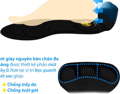 • Lót mũi giày đệm êm ngón chân bằng cao su non cực dẻo, đàn hồi và mịn màng.