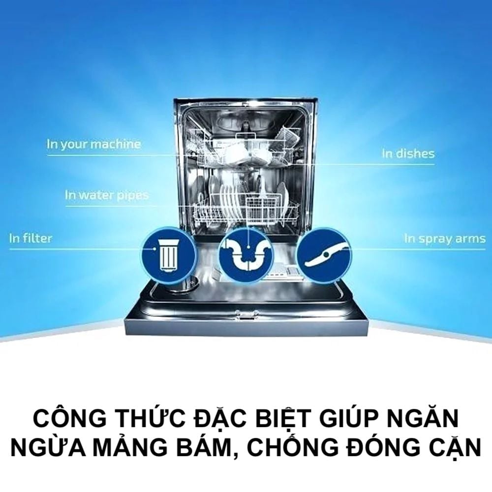 - Sức mạnh ưu việt cùng độ tinh khiết cao giúp làm mềm nước, ngăn tạp khoáng gây mảng bám, kết tủa trong lòng máy. Hơn nữa, bạn sẽ cảm nhận hiệu quả rõ rệt khi chén đĩa không còn vệt gợn trắng sau khi rửa.