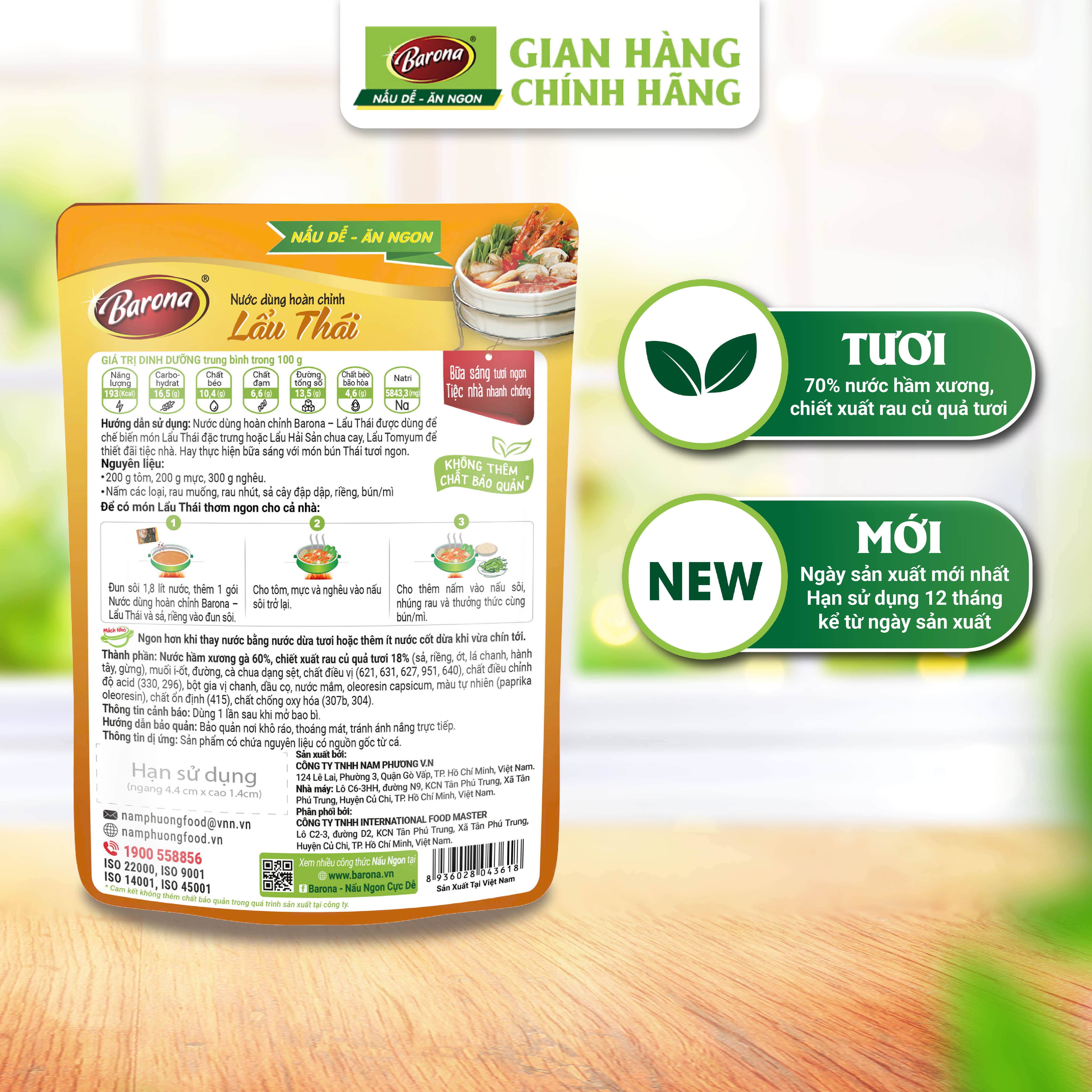 NƯỚC DÙNG HOÀN CHỈNH BARONA LẨU THÁI 180G Nước dùng hoàn chỉnh Barona - Lẩu Thái , Tươi Ngon Tự Nhiên với hơn 70% thành phần Nước hầm xương và Chiết xuất Rau củ quả