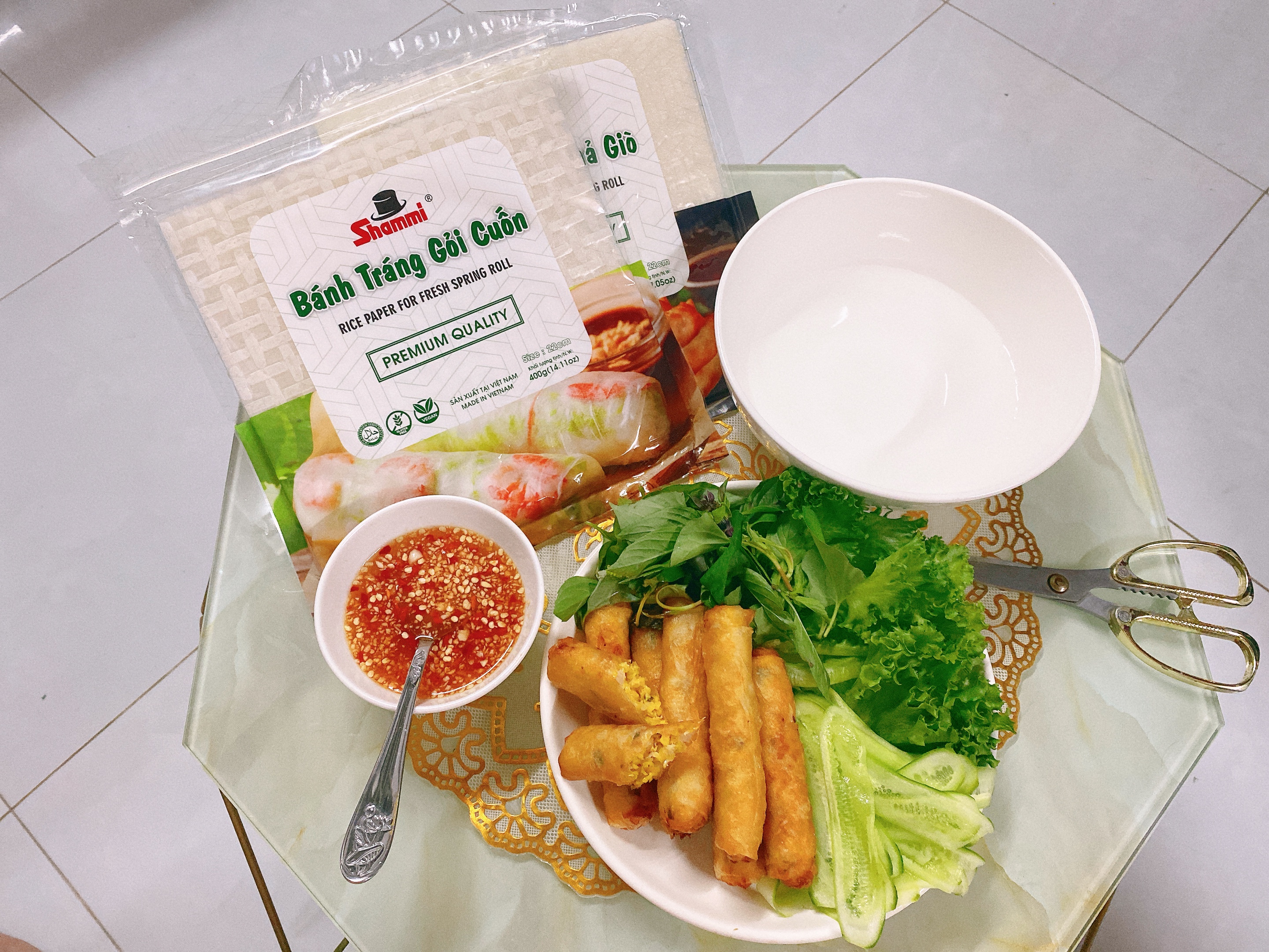 - KHÔNG gluten Sản phẩm đạt chứng chỉ HALAL, FSSC22000 có thể sử dụng được cả chay và mặn. Khối lượng: 200g Hạn sử dụng: 2 năm HƯỚNG DẪN SỬ DỤNG: 1/ Nhúng bánh tráng vào nước trong 4s, sau đó đặt bánh ra dĩa dẹp. 2/ Đặt rau, thịt, tôm hay topping bạn muốn vào giữa bánh, ở vị trí ⅓ từ dưới lên. 3/ Gấp bánh từ phía dưới lên. 4/ Gấp bánh từ phía 2 bên vào. 5/ Cuộn tròn bánh lại rồi thưởng thức với nước chấm tùy thích. THÀNH PHẦN DINH DƯỠNG (TRÊN 100G):