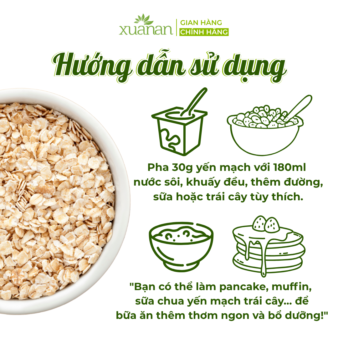 Pha 30 g yến mạch với 180 ml nước thật sôi, khuấy đều trước khi dùng, có thể thêm đường, sữa (sữa bột, sữa tươi), hoặc trái cây tuỳ theo sở thích.