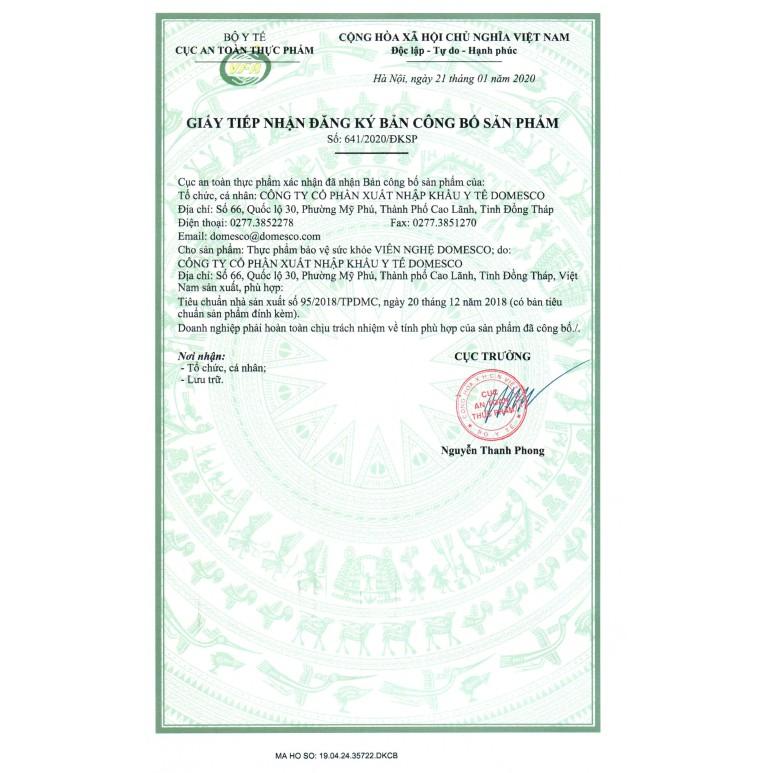 Mua tại TiktokViên nghệ vàng DOMESCO - Hộp 180 viên Thành phần Cao Nghệ vàng (tương đương 200 mg Nghệ vàng – Curcuma longa) ……. 50 mg Cao Nghệ đen (tương đương 120 mg Nghệ đen – Curcuma zedoaria) …… 20 mg Công dụng Hỗ trợ giúp giảm các triệu chứng với người bị viêm loét dạ dày, tá tràng như đầy hơi, đau dạ dày, tăng tiết dịch vị. Đối tượng sử dụng Người bị viêm loét dạ dày, tá tràng. Người bị chứng đầy hơi, khó tiêu do viêm loét dạ dày, tá tràng Cách dùng Người lớn: Uống 2 viên/lần, ngày 2 lần, trước bữa ăn 30 phút.