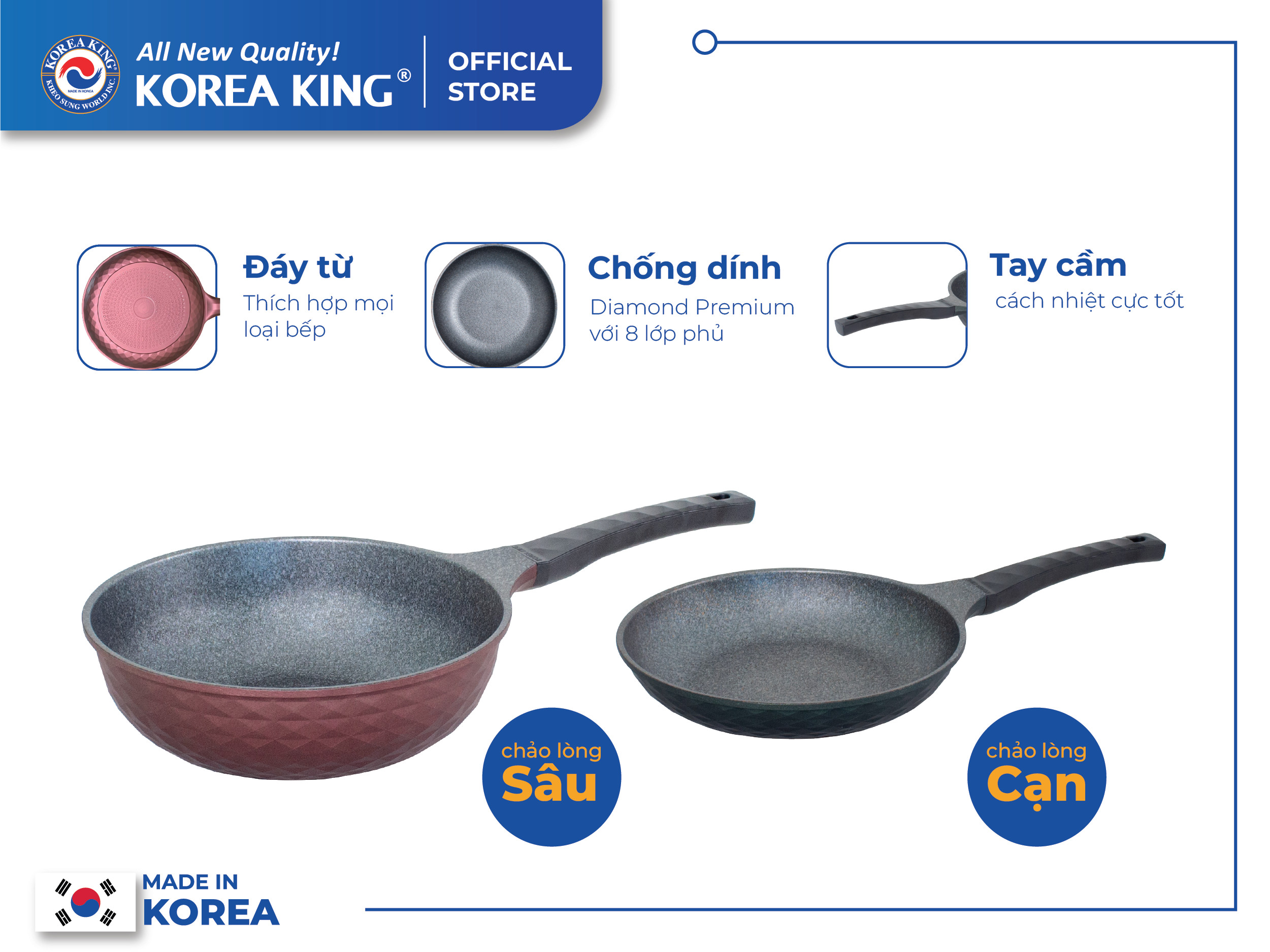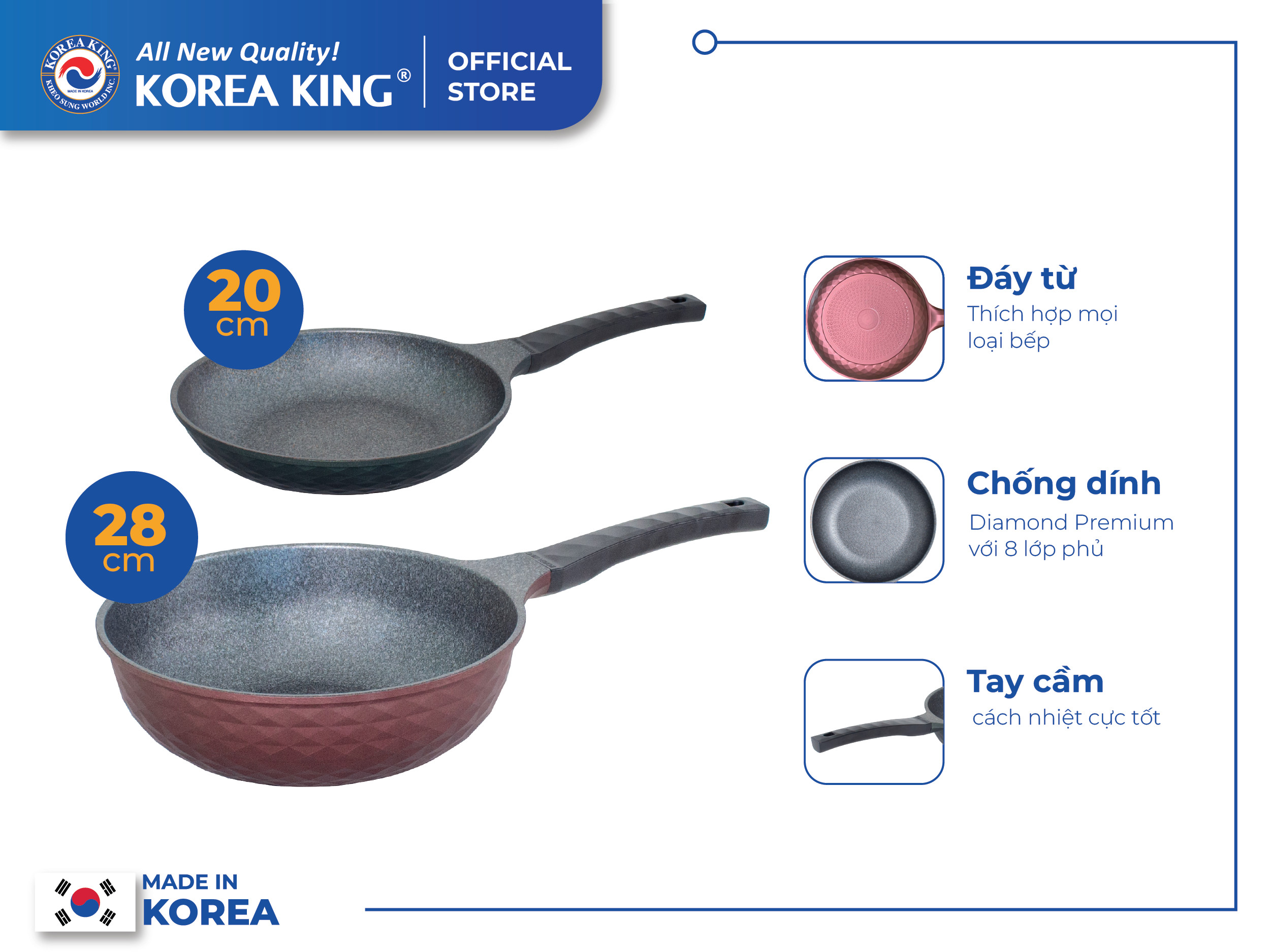 ✨Combo 2 chảo sâu, cạn Diamond Premium Korea King(1 Chảo cạn 20cm và 1 Chảo sâu 28cm)-Hàng chính hãng
