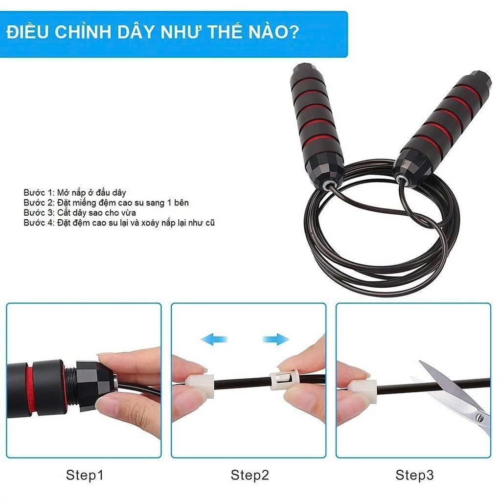 Chất liệu bền bỉ:Dây nhảy được làm từ lõi thép chắc chắn, giúp đảm bảo độ bền cao khi sử dụng.