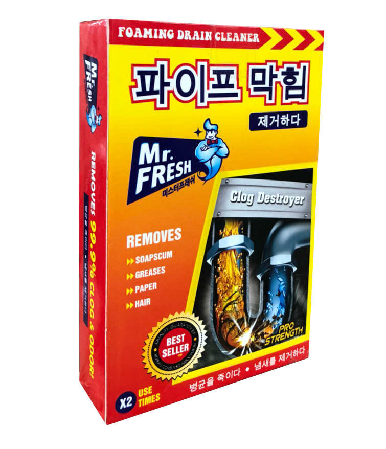 Bột thông tắc đường ống thoát nước Mr.Fresh Hàn Quốc là một trong những sản phẩm tốt nhất được bán chạy ở Hàn Quốc với công thức tiên tiến, các thành phần hóa học chuyên dụng, độ tẩy cực mạnh sẽ xoáy tan mọi cặn bẩn trong đường ống một cách hiệu quả.Sản phẩm sẽ thông sạch mọi loại cặn bẩn như giấy, rác, rau, mỡ, thịt, gạo, tóc… kẹt trong đường ống thoát nước của chậu rửa nhà bếp, lavabo, bồn tắm… mà không làm hư hại đường ống và các thiết bị vệ sinh.Bột thông tắc đường ống thoát nước Mr.Fresh Hàn Quốc trong thành phần của nó luôn có các hỗn hợp hóa học có độ kiềm, độ ăn mòn, độ phân hủy cực cao, giúp phân hủy các hợp chất hữu cơ, chất cặn bã có trong đường ống gây tắc nghẽn.