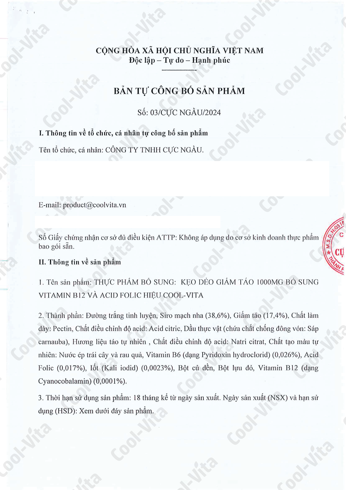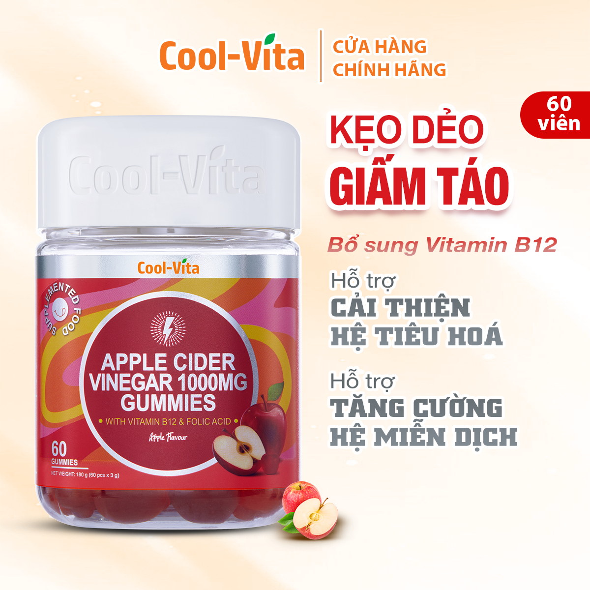 Kẹo dẻo giấm táo hỗ trợ bổ sung thêm Vitamin B12 & Axit Folic là một giải pháp bổ sung dinh dưỡng tiện lợi, hỗ trợ bạn cải thiện sức khỏe tiêu hóa và tăng cường hệ miễn dịch. Mỗi 2 viên kẹo dẻo chứa 1000mg giấm táo nguyên chất, kết hợp với các dưỡng chất quan trọng như Vitamin B12, Vitamin B6 và Axit Folic, mang lại hiệu quả tuyệt vời cho sức khỏe. Nếu bạn đang mong muốn cải thiện sức khỏe từ bên trong thì đừng nên bỏ qua sản phẩm Kẹo Dẻo Giấm Táo của CoolVita nhé!