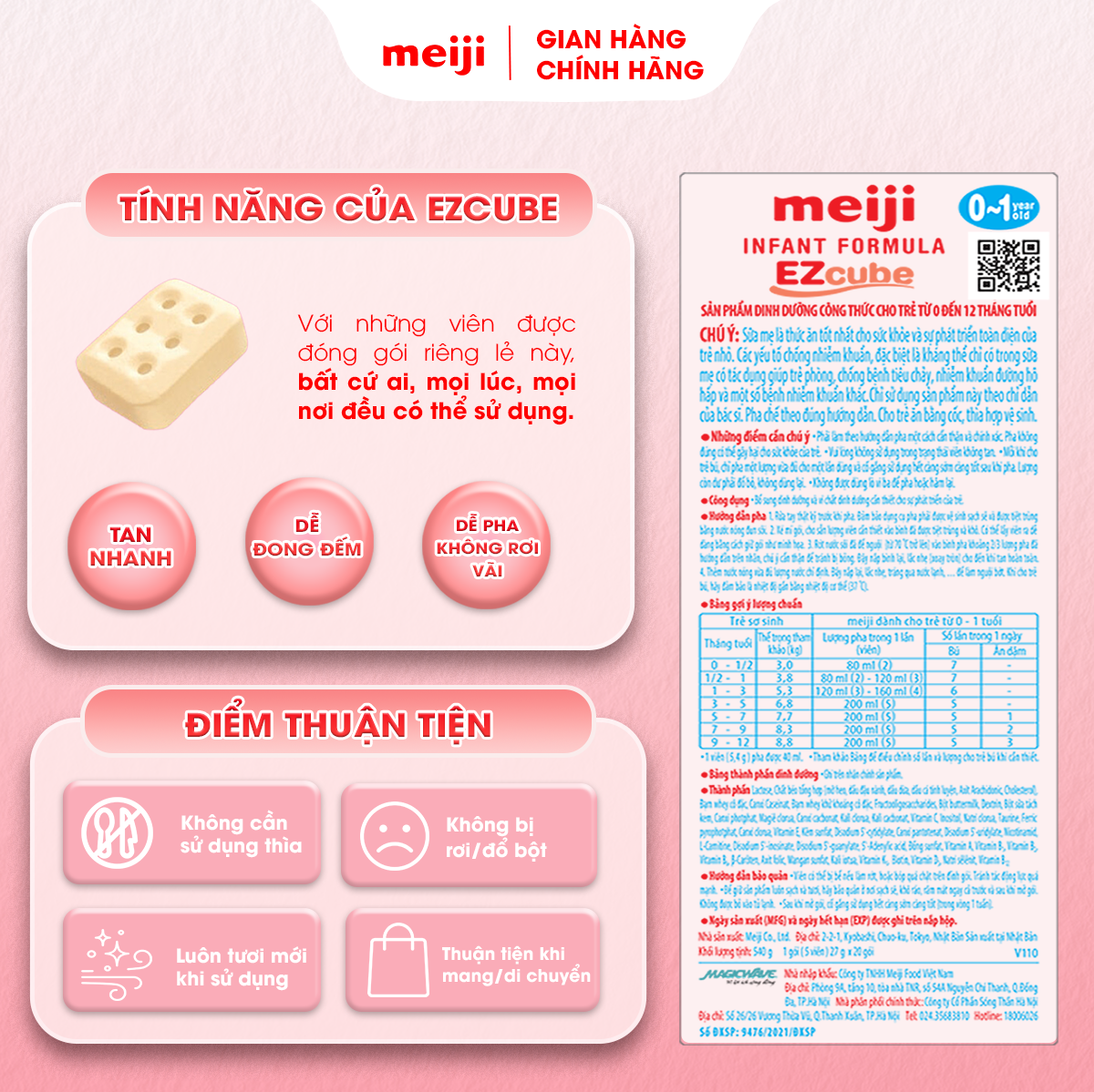 - Meiji Infant Formula EZcube là sản phẩm dạng viên, đóng gói trong hộp giấy hình hộp chữ nhật, trọng lượng 540g, 20 thanh/ hộp và 5 viên/ thanh. ĐẶC ĐIỂM SẢN PHẨM