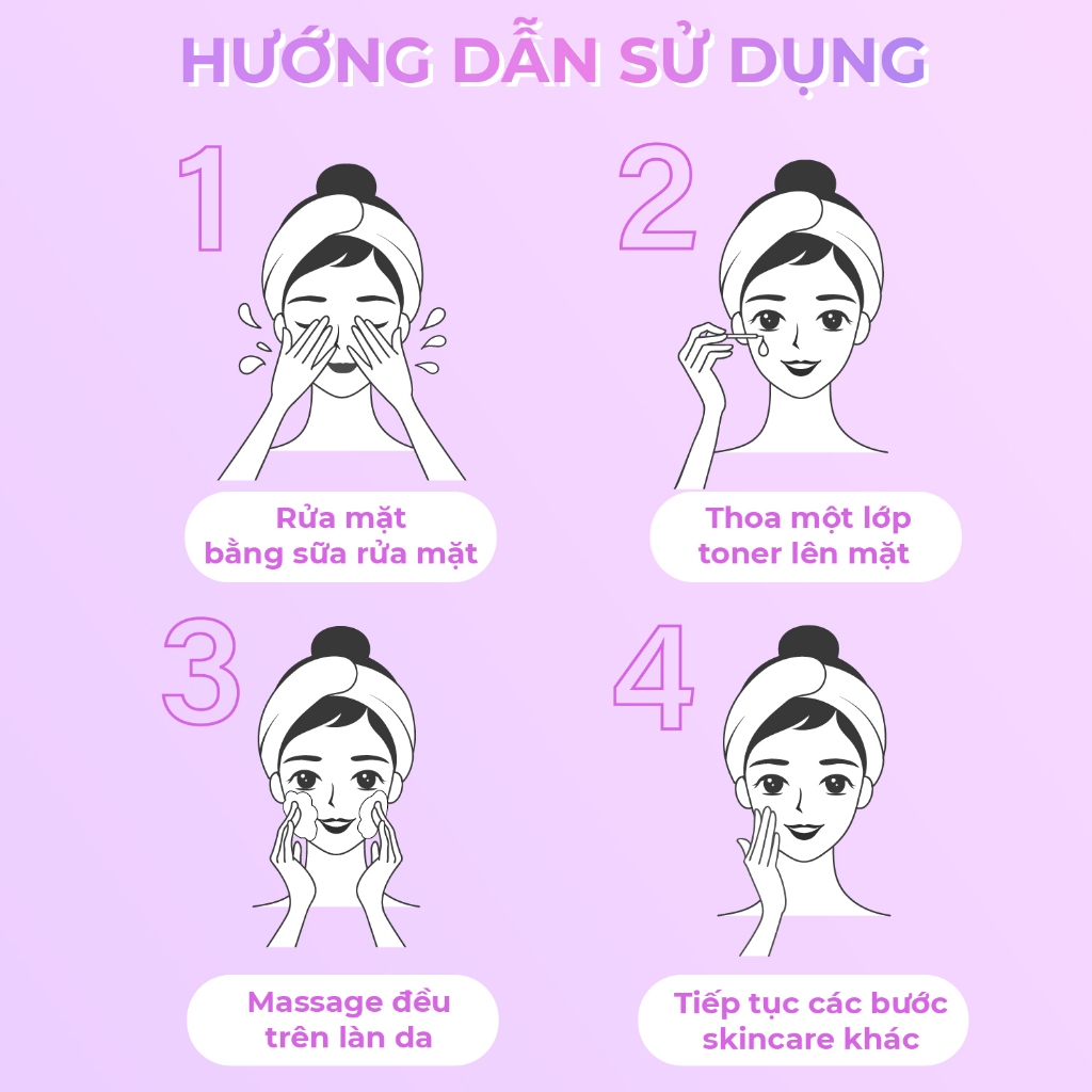 Nước dưỡng da chứa chiết xuất hạt Ý dĩ, Acid Hyaluronic và Collagen giúp dưỡng ẩm sâu cho da, mang lại một làn da căng sáng, mềm mịn, tươi trẻ. - CÁCH DÙNG Lấy một
