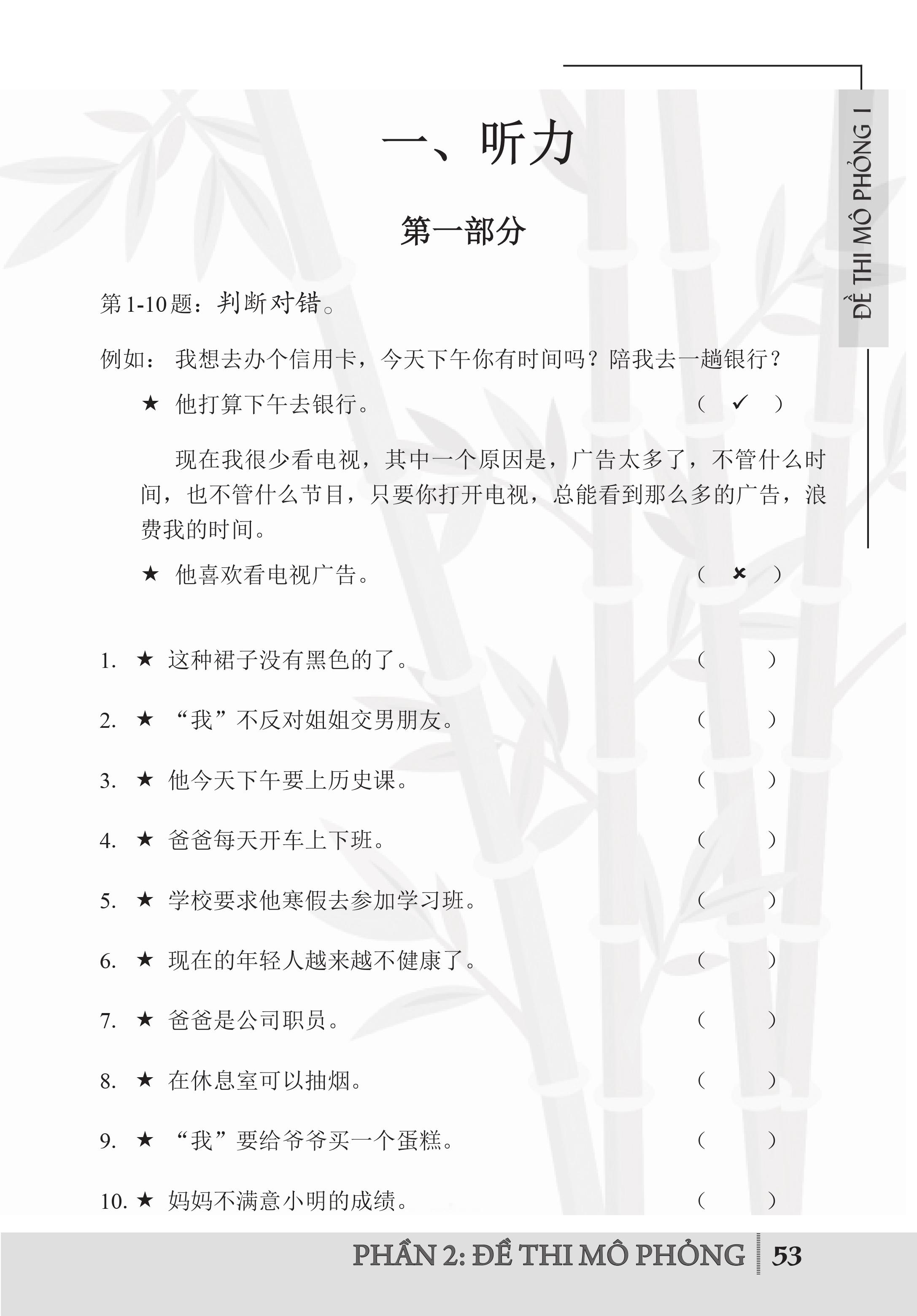 - Phần 2: Đề thi mô phỏng - cung cấp 12 bộ đề thi mô phỏng được biên soạn sát với đề thi thực của kỳ thi HSK cấp 4.
